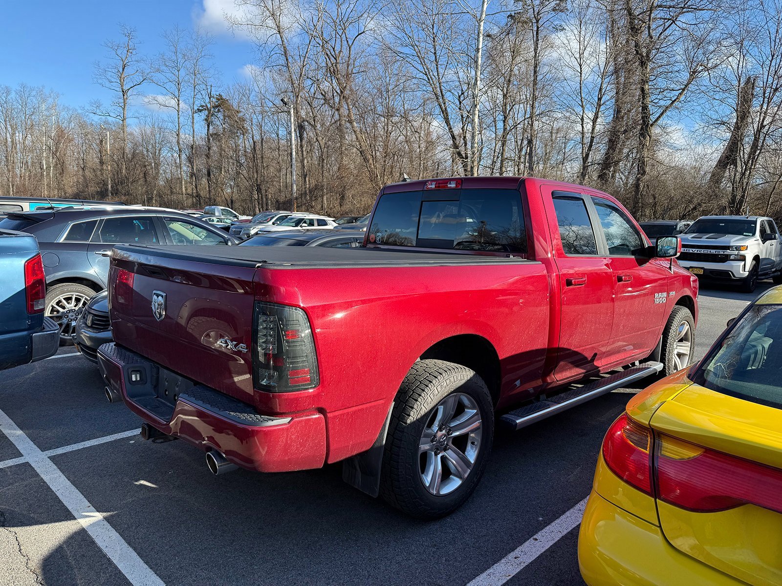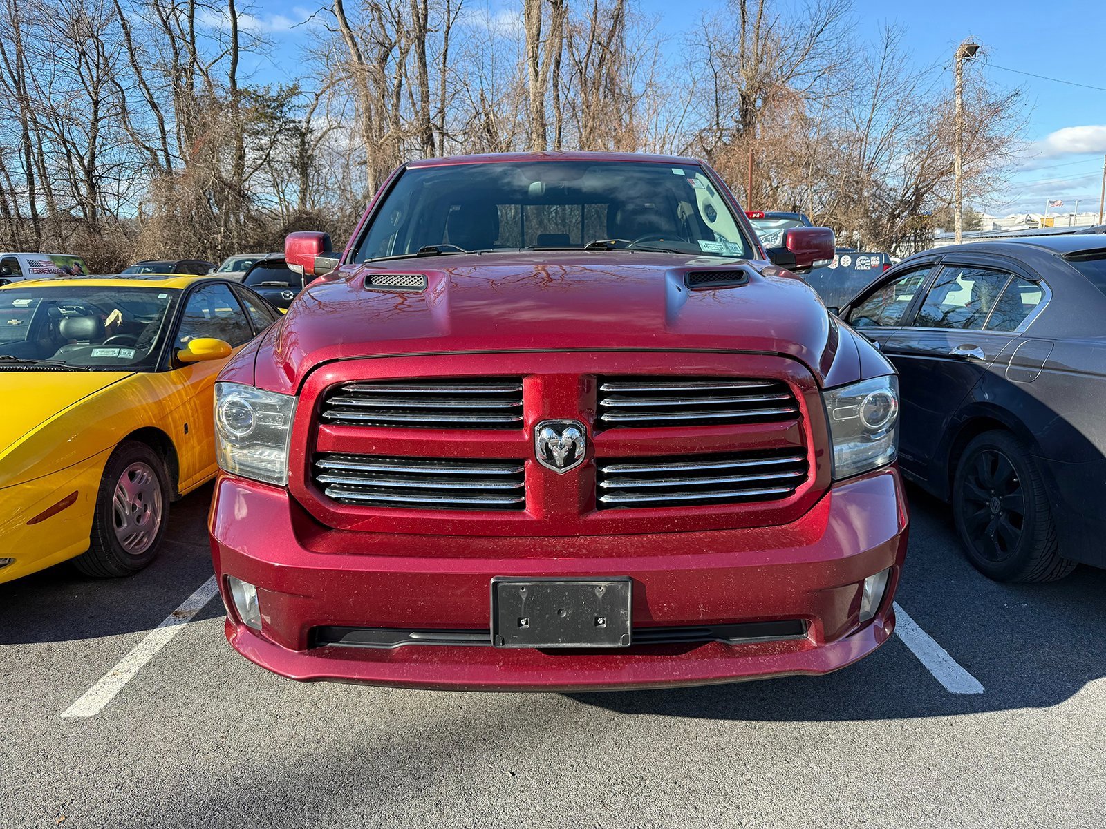 Deep Cherry Red Crystal Pearlcoat 2015 Ram 1500 Sport 4WD 8-Speed Automatic HEMI 5.7L V8 Multi Displacement VVT 1 Year Trial (Registration Required), 115V Auxiliary Power Outlet, 20 x 9 Polished/Painted Aluminum Wheels, 3.21 Rear Axle Ratio, 32 Gallon Fuel Tank, 4-Wheel Disc Brakes, 5-Year SiriusXM Traffic Service, 5-Year SiriusXM Travel Link Service, 6 Speakers, 8.4 Touch Screen Display, 9 Amplified Speakers w/Subwoofer, ABS brakes, Adjustable pedals, Air Conditioning, Alloy wheels, AM/FM radio, Auto High Beam Headlamp Control, Auto-dimming door mirrors, Auto-dimming Rear-View mirror, Automatic temperature control, Brake assist, Bucket Seats, Bumpers: body-color, Class IV Receiver Hitch, Cloth Bucket Seats, Compass, Convenience Group, Delay-off headlights, Driver door bin, Driver vanity mirror, Dual front impact airbags, Dual front side impact airbags, Electronic Stability Control, Emergency communication system, Folding Flat Load Floor Storage, Front anti-roll bar, Front Bucket Seats, Front Center Armrest w/Storage, Front dual zone A/C, Front fog lights, Front reading lights, Front wheel independent suspension, Fully automatic headlights, Garage door transmitter, GPS Antenna Input, GPS Navigation, Harman Radio Manufacturer, HD Radio, Heated door mirrors, Heated Front Seats, Heated front seats, Heated steering wheel, High Back Seats, Illuminated entry, Integrated Voice Command w/Bluetooth, Keyless Enter-N-Go, Leather steering wheel, Low tire pressure warning, Media Hub (SD, USB, AUX), Occupant sensing airbag, Outside temperature display, Overhead airbag, Overhead console, Panic alarm, ParkView Rear Back-Up Camera, Passenger door bin, Passenger vanity mirror, Power door mirrors, Power driver seat of power lumbar adjust of power steering and power windows to. Check our Google reviews and allow our customers to tell you where you should consider purchasing a pre-owned vehicle in the tri-state area.