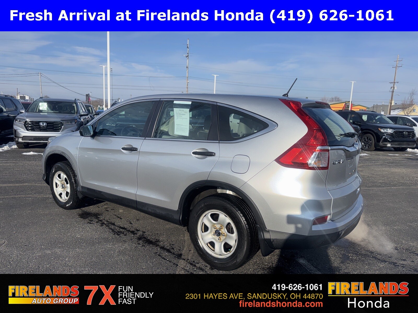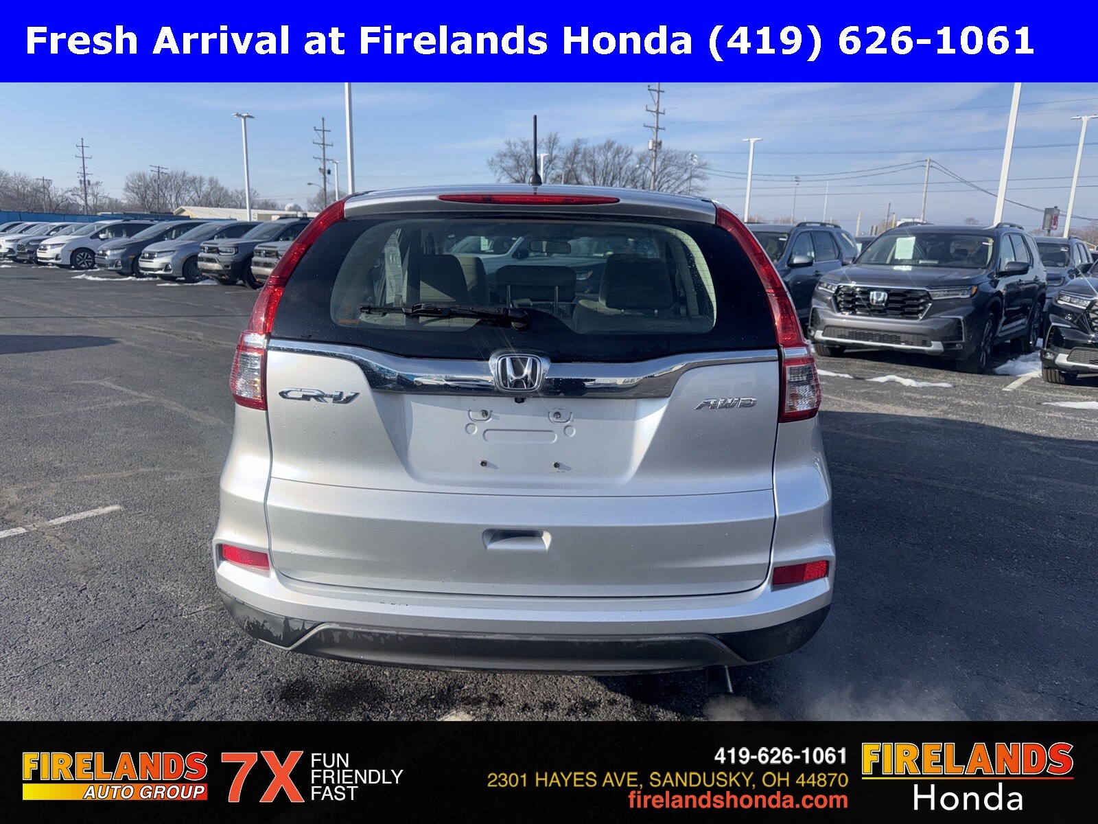 Firelands Honda is proud to offer this outstanding-looking 2016 Honda CR-V in Alabaster Silver Metallic. This CR-V has been checked by our award winning service department. Hot features include: Bluetooth Hands Free, Back Up Camera, Local Trade, Service Records Available, All-Wheel Drive, Honda Certified, One Owner. Certified. Odometer is 77468 miles below market average! 25/31 City/Highway MPG AWD CVT 2.4L I4 DOHC 16V i-VTEC. Kelley Blue Book Brand Image Awards are based on the Brand Watch(tm) study from Kelley Blue Book Market Intelligence. Award calculated among non-luxury shoppers. For more information, visit www.kbb.com. Kelley Blue Book is a registered trademark of Kelley Blue Book Co., Inc. Firelands Honda isn't only a place for those in the market for a new Honda car. We're also the go-to spot for those already behind the wheel. Customers find our car service and maintenance center, also located in Sandusky, Ohio, both convenient and competent. It doesn't stop there-- Firelands Honda also host an array of services to personalize or enhance your Honda driving experience. Just ask our onsite auto parts and accessories department what we mean. Still not clear about why so many trust Firelands Honda for all of their Honda needs? Visit our dealership at 2301 Hayes Ave. Sandusky, Ohio and find out for yourself! You can reach us by phone at 419-626-1061 or shop 24/7 at www.firelandshonda.com.