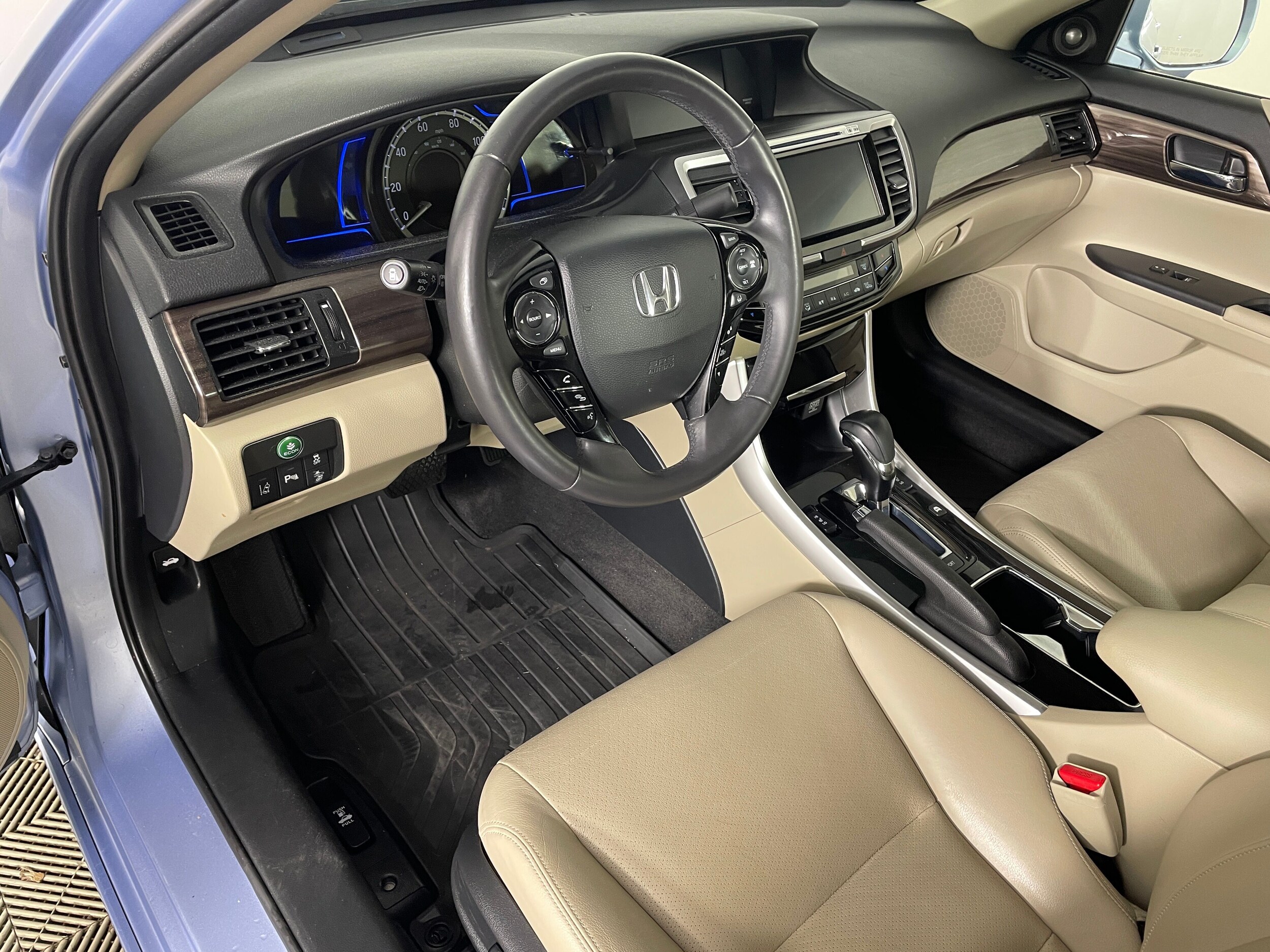 The 2017 Honda Accord Hybrid Touring is the top-trim, well-equipped version of Honda's 2017 midsize hybrid sedan blending efficiency, comfort, performance, and a refined driving experience. It uses a two-motor hybrid system (a 2.0-liter i-VTEC Atkinson-cycle 4-cylinder + electric motors) that together produce about 212 horsepower while still delivering EPA fuel economy around 49/47/48 mpg (city/highway/combined) among the best in its class, and a strong balance of power and efficiency. Inside, the Touring brings a premium cabin: leather seats (perforated), power-adjustable front seats including the passenger side, dual-zone auto climate control, and a nicely finished dashboard with wood-grain-style trim. The tech and convenience amenities add up: a dual-screen setup with a 7-inch touchscreen infotainment system offering smartphone integration (Apple CarPlay and Android Auto), navigation, HD/Satellite/HD-Radio, remote engine start, push-button start, and more. On the outside and in terms of ride quality, the 2017 Accord Hybrid gets a refreshed, more dynamic styling sharper front fascia, LED lighting (DRLs, taillights, fog lights; LED headlights on Touring), alloy wheels, and even rain-sensing wipers and front/rear parking sensors on the Touring trim. The chassis and suspension benefit from upgrades like increased body rigidity, tuned dampers, and retuned electric power steering for smoother, more controlled handling.