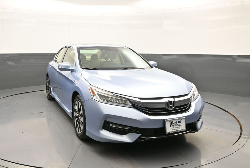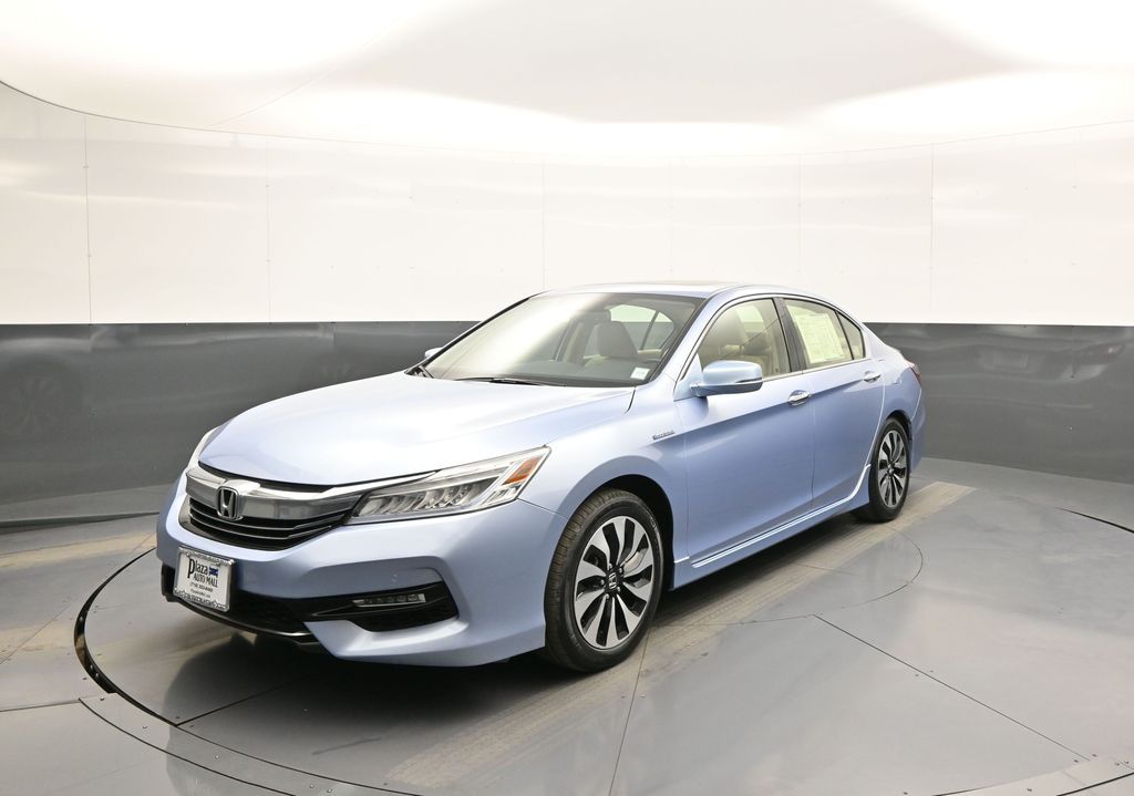 This 2017 Honda Accord Hybrid Touring features an odometer reading 8,667 miles below the market average. This one-owner sedan in Lunar Silver Metallic perfectly blends premium luxury with incredible hybrid efficiency and a recent professional detail. Experience reassuring handling and quick acceleration from the 2.0L i-VTEC hybrid engine. You’ll enjoy an impressive 49/47 City/Highway MPG alongside advanced driver-assist tech that delivers top-tier safety and confidence on every drive. The spacious cabin features heated leather seating, a power sunroof, and integrated Navigation. Stay connected with Apple CarPlay while enjoying the quiet, refined ride that earned this model prestigious KBB Brand Image awards. This vehicle passed a 112-point inspection and includes a limited warranty. You’ll also benefit from a complimentary oil change and one year of Honda Care Roadside Assistance for total peace of mind. With a Clean CARFAX and one-owner history, this sedan is ready for the road with new tires and fresh fluids. It even includes a pre-installed Lojack theft protection system for your long-term security.