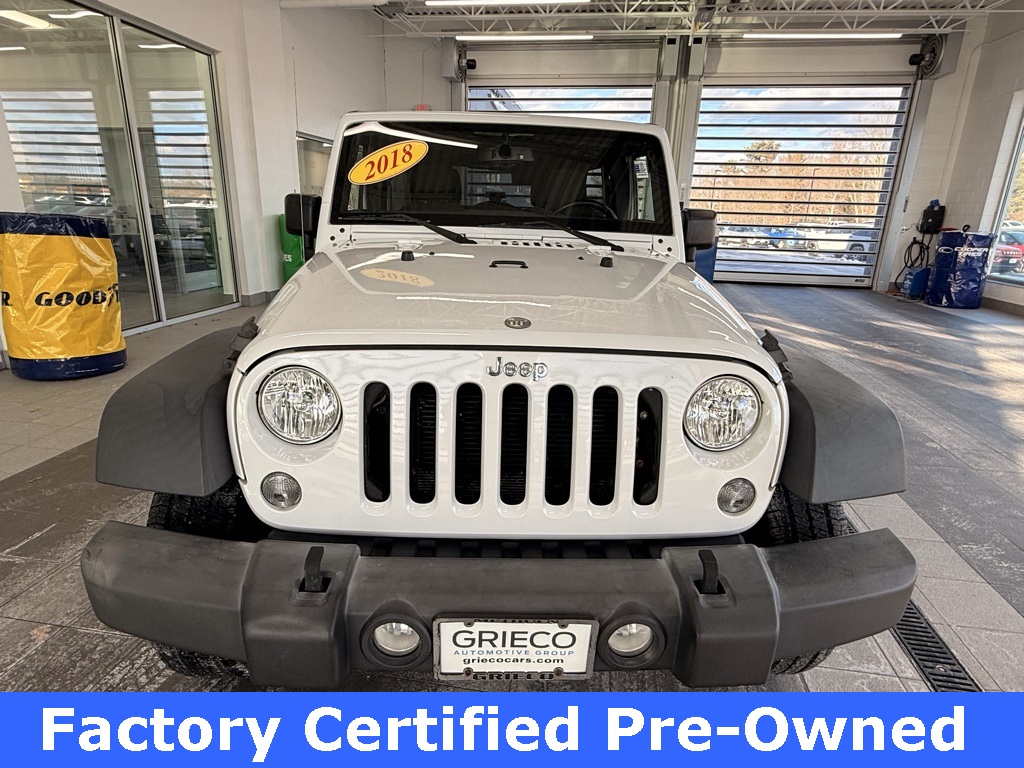 Recent Arrival! Certified. 2018 Jeep Wrangler JK Unlimited Sport Bright White Clearcoat. Certified Pre-Owned Go Details: Roadside Assistance, Limited Warranty, Warranty Deductible, 125 Point Inspection, Vehicle History, Vehicles Between 6-10 Model Years and/or 75,001-120,000 Miles. Thorough Reconditioning Process Using Authentic Mopar Parts. 3-Month Trial Subscription for SiriusXM Guardian and Satellite Radio. Clean CARFAX. Grieco Chrysler Jeep Dodge Ram is out to be #1. We will not lose a deal to price. Lease and loan quoting are dynamic, so payments and terms are subject to change before contracting. Please call 978-291-7872 for a detailed quote and confirm availability. We ship nationwide!
