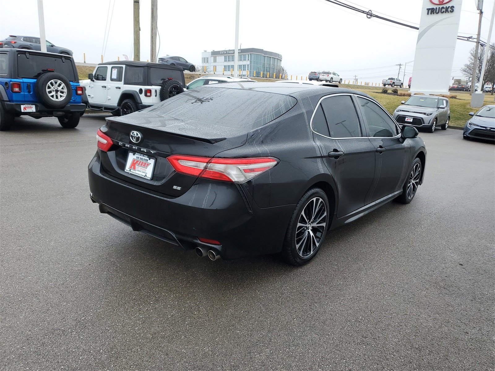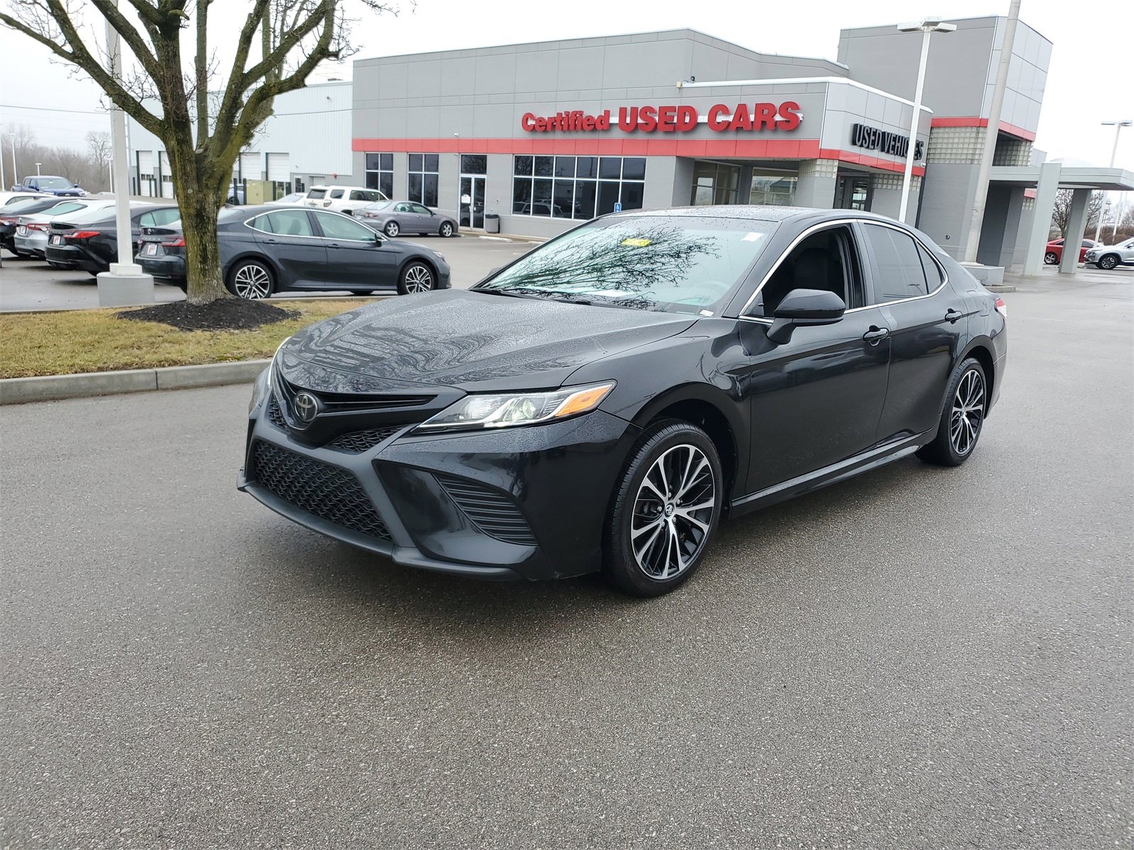 Proudly serving Cincinnati, Florence, Alexandria, Dayton, Hamilton, Dry Ridge, Lexington, Louisville, Nicholasville. Certified. Midnight Black Metallic 2018 Toyota Camry SE FWD 8-Speed Automatic 2.5L I4 DOHC 16V 6 Speakers, ABS brakes, Active Cruise Control, Alloy wheels, AM/FM radio, Auto High-beam Headlights, Brake assist, Bumpers: body-color, Delay-off headlights, Electronic Stability Control, Exterior Parking Camera Rear, Fully automatic headlights, Illuminated entry, Knee airbag, Leather Shift Knob, Low tire pressure warning, Panic alarm, Passenger door bin, Power door mirrors, Radio data system, Radio: Entune 3.0 Audio, Remote keyless entry, Security system, Speed control, Spoiler, Traction control, Variably intermittent wipers, Wheels: 8.0J x 18" Black Machined-Finish Alloy. Recent Arrival! Odometer is 575 miles below market average! 29/41 City/Highway MPG.