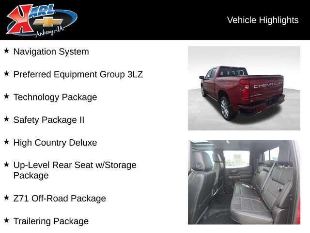 Recent Arrival! Certified. Local Trade, Sold New at Karls & All Services Done at Karls! Equipped With Power Running Boards & Tonneau Cover! Cajun Red Tintcoat 2019 Chevrolet Silverado 1500 High Country 4WD Crew Cab 147 High Country EcoTec3 6.2L V8 10-Speed Automatic, 4WD, Jet Black Leather, 15 Diagonal Head-Up Display, 170 Amp Alternator, 2nd Row Heated Outboard Seats, 8 Driver Information Center, Advanced Trailering System, Apple CarPlay/Android Auto, Auto-Dimming Inside Rear-View Mirror, Bluetooth For Phone, Chevytec Spray-On Black Bedliner, Chrome Recovery Hooks, Driver Memory, Electric Rear-Window Defogger, Electrical Lock Control Steering Column, Electronic Cruise Control, Following Distance Indicator, Forward Collision Alert, Front dual zone A/C, Front LED Fog Lamps, HD Radio, HD Rear Vision Camera, HD Surround Vision, Heated Driver & Front Passenger Seats, Heated Steering Wheel, Heavy-Duty Rear Locking Differential, High Country Deluxe, Hill Descent Control, Hitch Guidance w/Hitch View, Integrated Trailer Brake Controller, IntelliBeam Automatic High Beam On/Off, Keyless Open & Start, Lane Change Alert w/Side Blind Zone Alert, Lane Keep Assist w/Lane Departure Warning, LED Cargo Area Lighting, Low Speed Forward Automatic Braking, Manual Tilt/Telescoping Steering Column, Navigation System, Off-Road Suspension, OnStar & Chevrolet Connected Services Capable, Outside Heated Power-Adjustable Mirrors, Power Door Locks, Power driver seat, Power Sliding Rear Window w/Rear Defogger, Power Sunroof, Power windows, Power-Retractable Assist Steps, Preferred Equipment Group 3LZ, Rear Camera Mirror, Rear Cross Traffic Alert, Rear Dual USB Charging-Only Ports, Rear Wheelhouse Liners, Remote Vehicle Starter System, Safety Package II, SiriusXM Radio, Steering Wheel Audio Controls, Technology Package, Theft Deterrent System (Unauthorized Entry), Trailer Tire Pressure Monitor System, Trailering Package, Ultrasonic Front & Rear Park Assist, Universal Home Remote, Up-Level Rear Seat w/Storage Package, Ventilated Driver & Front Passenger Seats, Wheel Locks (Set of 4) (LPO), Wheels: 22 x 9 Polished Aluminum, Wireless Charging, Z71 Off-Road Package. 16/20 City/Highway MPG 10-Speed Automatic 4WD.