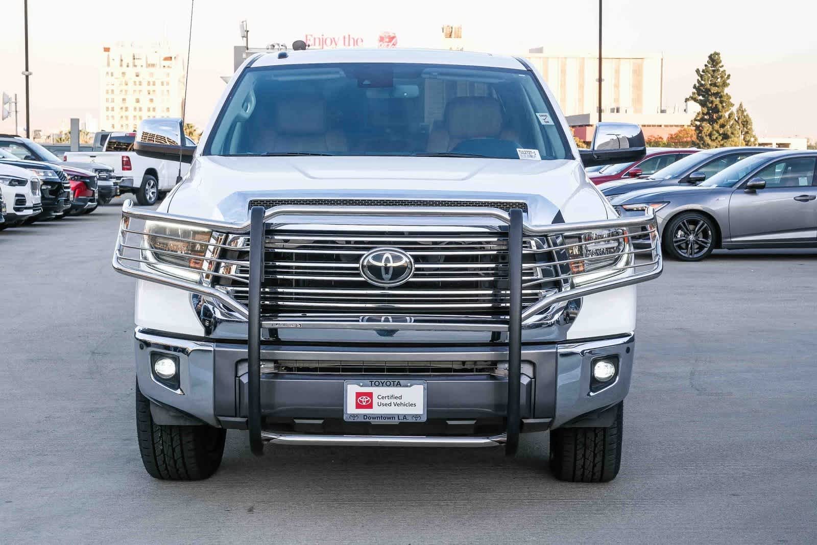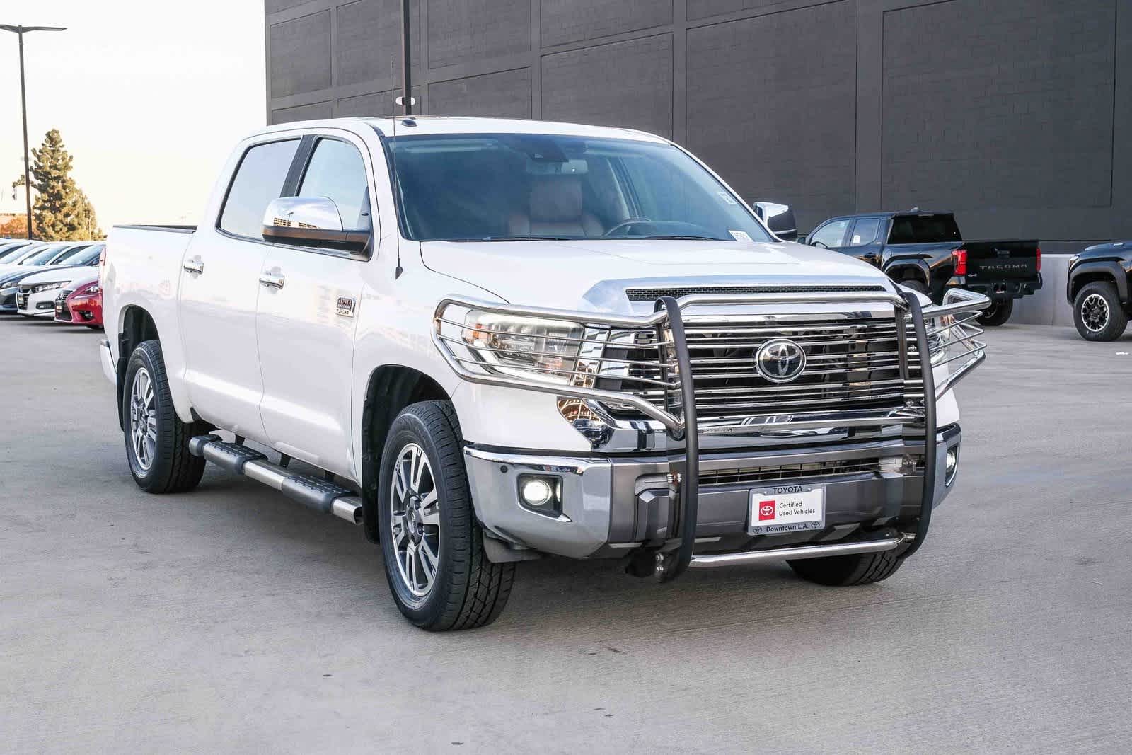 Welcome to Toyota of Downtown LA... Certified. 2019 Toyota Tundra 1794 CrewMax Super White 4WD 6-Speed Automatic Electronic i-Force 5.7L V8 DOHC 32V LEV 4WD, Brown/Black w/Leather Seat Trim (LD), 12 Speakers, 1794 Grade Package, AM/FM radio: SiriusXM, Entune App Suite, Entune App Suite, Entune App Suite, Exterior Parking Camera Rear, Power driver seat, Power steering, Power Tilt & Slide Moonroof w/Sliding Sunshade, Power windows, Radio data system, Radio: Entune Premium JBL Audio AM/FM/HD Radio/CD, Remote keyless entry, SIRIUSXM Satellite Radio, Steering wheel mounted audio controls, Western Grade Package, Wheels: 20 x 8J 6-Spoke Alloy w/Accented Spokes.