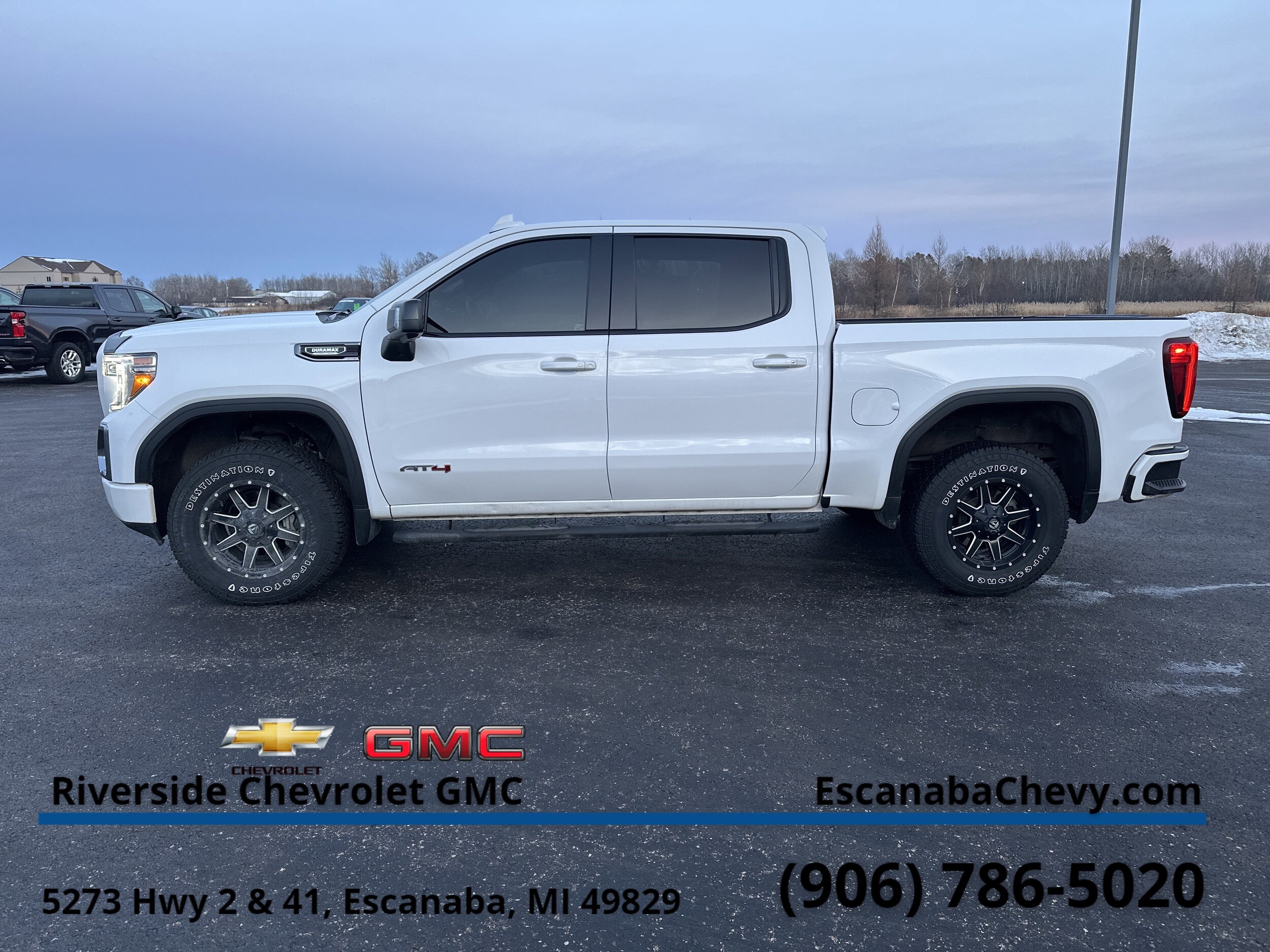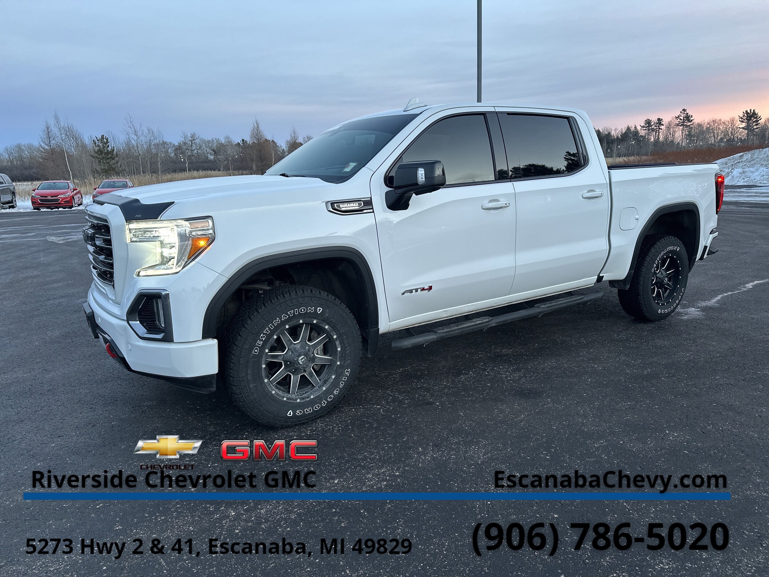 GMC AT4 with Summit White exterior and Jet Black with Kalahari accents interior features a Straight 6 Cylinder Engine with 277 HP at 3750 RPM. Nav System, Moonroof, Heated/Cooled Seats, 4x4, Turbo Charged Engine, Bed Liner, Hitch, Heated Rear Seat, AT4 Preferred Package. GMC AT4 with Summit White exterior and Jet Black with Kalahari accents interior features a Straight 6 Cylinder Engine with 277 HP at 3750 RPM.