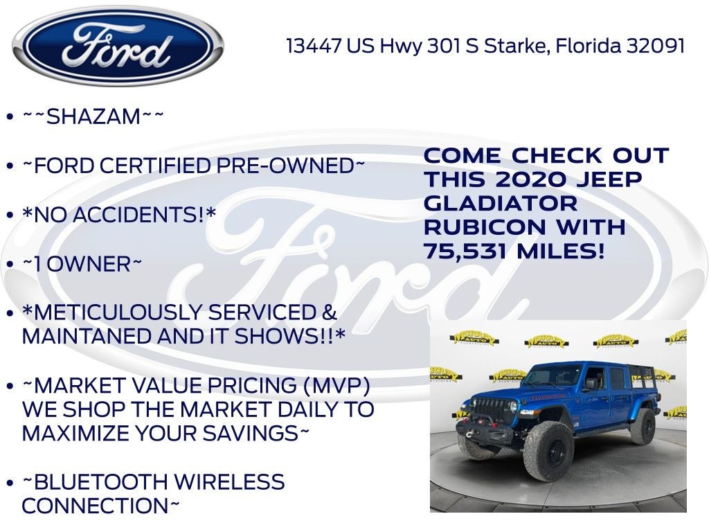 Recent Arrival! CARFAX One-Owner. Murray Ford Superstore of Starke is excited to offer this fantastic-looking 2020 Jeep Gladiator in Hydro Blue Pearlcoat. This vehicle is readily available and comes with the following Quick Order Package 24R, Trailer Tow Package, Ford Blue Advantage: Blue Certified Certified, and more. Murray Ford of Kingsland, Inc. is one of the leading Jeep dealers for selling the used 2020 Jeep Gladiator Kingsland. Our customers come to our Ford dealership showroom located in Kingsland, Jacksonville Beach, Saint Augustine, and Orange Park, GA. Whether you are from Kingsland, Jacksonville Beach, Saint Augustine, and Orange Park, GA, we hope you will give us a chance to show why Murray Ford of Kingsland, Inc. Ford of Kingsland, Georgia is the one of the best Ford dealers selling and servicing 2020 Jeep Gladiator 4D Crew Cab Rubicon in the Kingsland area.
