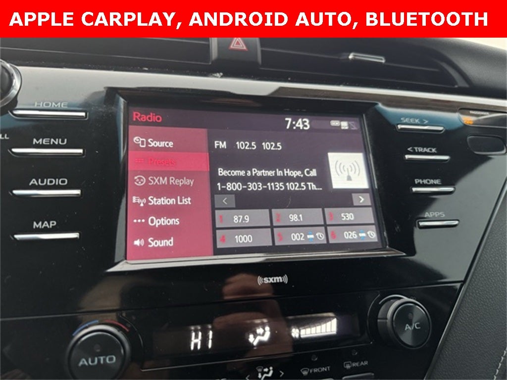 Experience sporty efficiency and advanced safety in this Certified 2020 Toyota Camry SE FWD, finished in striking Midnight Black Metallic and delivering an impressive 28/39 MPG. Designed for confidence, it features a Collision Warning System, Adaptive Cruise Control, Lane safety technologies, and a Backup Camera, all supported by Safety Connect and Electronic Stability Control. Inside, you'll enjoy Apple CarPlay, Android Auto, Bluetooth Hands Free, Touchscreen Controls, Sirius Radio, and a premium AM/FM audio system powered by 6 speakers. Comfort and convenience come standard with Sport Fabric/SofTex seats, a power driver seat, automatic temperature control, keyless entry, fully automatic headlights, and a sport steering wheel with mounted audio controls. This Camry SE also includes Alloy wheels, 18 Black Machined-Finish Wheels, 4-Wheel Disc Brakes, ABS, power windows, power door mirrors, and a rear window defroster. With its clean CARFAX and standout styling, this 2020 Camry SE FWD offers the perfect blend of reliability, performance, and modern tech for everyday driving.