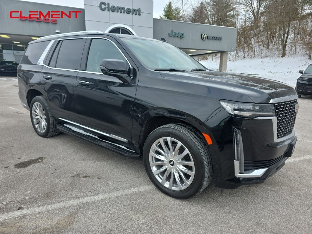 Recent Arrival! Certified. 4WD, Black Leather. Black Raven 2021 Cadillac Escalade Premium Luxury 6.2L V8 4WD Clean CARFAX. This Escalade is well equipped with Preferred Equipment Group 1SB, Clement Assurance Certified, 4WD, Black Leather, 16.9" Diagonal OLED Infotainment Screen, 19 Speakers, 2-Presets Memory For Driver Seat Adjuster, 3rd row seats: split-bench, 4-Way Power Driver Lumbar Seat Adjuster, 4-Way Power Front Passenger Lumbar Seat Adjuster, Alloy wheels, Apple CarPlay/Android Auto, Auto High-beam Headlights, Auto tilt-away steering wheel, Auto-dimming door mirrors, Auto-dimming Rear-View mirror, Brake assist, Compass, Delay-off headlights, Dual front impact airbags, Dual front side impact airbags, Electronic Stability Control, Emergency communication system: OnStar and Cadillac connected services capable, Four wheel independent suspension, Front anti-roll bar, Front Bucket Seats, Front Center Armrest w/Storage, Front dual zone A/C, Front License Plate Bracket, Front reading lights, Fully automatic headlights, Garage door transmitter, HD Radio, Heads-Up Display, Heated & Ventilated Driver & Front Passenger Seats, Heated door mirrors, Heated Driver & Front Passenger Seats, Heated front seats, Heated rear seats, Heated steering wheel, Illuminated Cargo Sill Plate (LPO), Illuminated entry, Leather Seating Surfaces w/Mini-Chevron Perf Inserts, Leather steering wheel, Low tire pressure warning, Memory seat, Navigation System, Not Equipped w/Automatic Stop/Start, Not Equipped w/Steering Column Lock, Occupant sensing airbag, Outside temperature display, Overhead airbag, Overhead console, Panic alarm, Passenger door bin, Passenger vanity mirror, Power door mirrors, Power driver seat, Power Liftgate, Power moonroof, Power passenger seat, Power steering, Power windows, Premium Smooth Ride Suspension, Puddle Lamps w/Cadillac Crest (LPO), Radio data system, Radio: AM/FM/SiriusXM w/Navigation, Rain sensing wipers, Rear air conditioning, Rear anti-roll bar, Rear reading lights, Rear Seat Entertainment System, Rear window defroster, Rear window wiper.