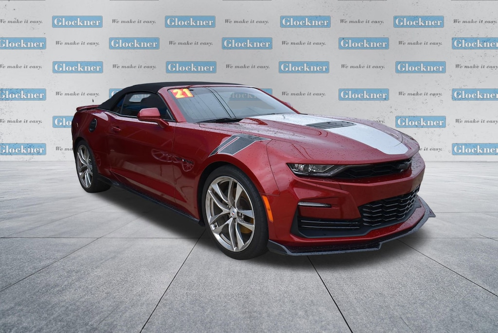 Glockner of Ironton is proud to offer this outstanding-looking 2021 Chevrolet Camaro in Wild Cherry Tintcoat. This 2021 Chevrolet Camaro has passed our comprehensive inspection and comes with the following features; Preferred Equipment Group 2SS, Wild Cherry Design Package 1 (Black Camaro Emblem Fender Badge, Black Metallic Hash Mark Stripes (LPO), Camaro Logo Wheel Center Caps (LPO), Premium Carpeted Floor Mats w/Camaro Logo (LPO), and Wheels: 20 x 8.5 Fr/20 x 9.5 Rr 5-Split Spoke), Wild Cherry Design Package 2 (Black Fuel Filler Door (LPO), Black Sueded Knee Pads (LPO), and Second Generation Ground Effects (LPO)), Glockner Certified Certified, 2.77 Rear Axle Ratio, 4-Wheel Disc Brakes, 6-Way Power Front Passenger Seat Adjuster, 7 Speakers, 8-Way Power Driver Seat Adjuster, ABS brakes, Air Conditioning, Alloy wheels, AM/FM radio: SiriusXM with 360L, Apple CarPlay/Android Auto, Auto-dimming door mirrors, Automatic temperature control, Bluetooth For Phone, Bose Premium 7-Speaker Audio System Feature, Brake assist, Bumpers: body-color, Compass, Convertible roof lining, Custom Launch Control, Delay-off headlights, Driver door bin, Driver vanity mirror, Dual front impact airbags, Dual front side impact airbags, Dual Mode Exhaust, Electronic Stability Control, Exterior Parking Camera Rear, Four wheel independent suspension, Front anti-roll bar, Front Bucket Seats, Front Center Armrest, Front dual zone A/C, Front reading lights, Front Sport Bucket Seats, Fully automatic headlights, Glass rear window, Heads-Up Display, Heated door mirrors, Heated Driver & Front Passenger Seats, Heated front seats, Heated steering wheel, Illuminated entry, Knee airbag, Leather Shift Knob, Leather-Trimmed Seat Trim, Low tire pressure warning, Memory seat, Occupant sensing airbag, Outside temperature display, Paddle-Shift Manual Controls, Panic alarm, Passenger door bin, Passenger vanity mirror, Power convertible roof, Power door mirrors, Power driver seat, Power passenger seat, Power steering, Power windows, Premium audio system: Chevrolet Infotainment System, Radio data system, Radio: Chevrolet Infotainment 3 Plus System, Rear anti-roll bar, Rear window defroster, Remote keyless entry, Remote Vehicle Starter System, Security system, Silver Center Stripe, SiriusXM w/360L, Speed control, Speed-sensing steering, Spoiler, Steering wheel mounted audio controls, Tachometer, Telescoping steering wheel, Tilt steering wheel, Traction control, Transmission Oil Cooler, Trip computer, Variably intermittent wipers, Ventilated Driver & Front Passenger Seats, Ventilated front seats, Voltmeter, and Wheels: 20 x 8.5 Fr & 20 x 9.5 Rr 5-Spoke Alum. Odometer is 6618 miles below market average!