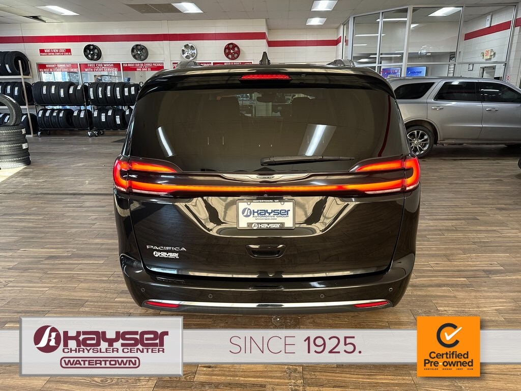 Certified Pre-Owned 2021 Chrysler Pacifica Touring L Van Passenger Van. The Pacifica offers a comfortable and versatile interior with leather upholstery, heated front seats, and a power liftgate. It features a V-6 engine, front-wheel drive, and a host of advanced safety and convenience features. The vehicle is in excellent condition, with only 85,658 miles on the odometer, and is available for sale at the Kayser Chrysler Center of Watertown.