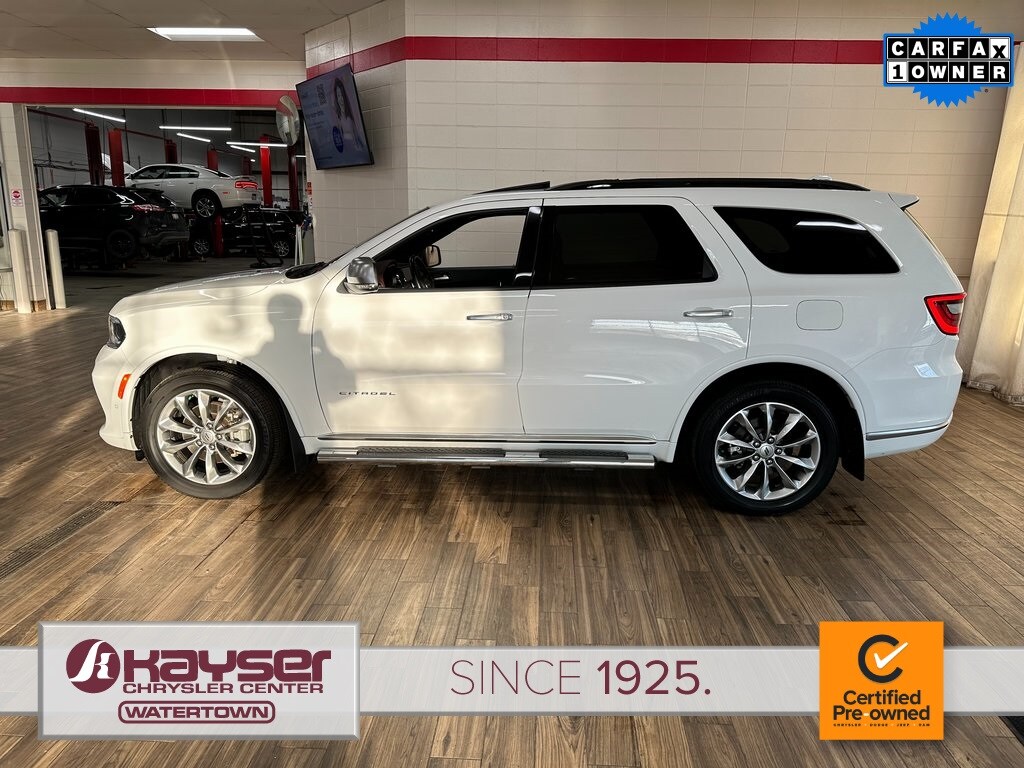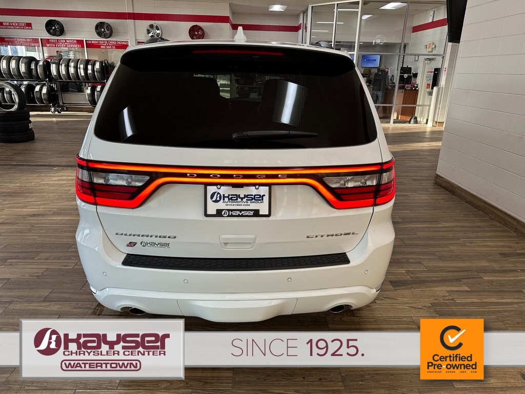 Certified Pre-Owned 2021 Dodge Durango Citadel SUV. White Knuckle exterior with a red, silver and red interior. Clean title and history. Local trade with only one owner. GPS navigation and a full suite of comfort and safety features. This SUV is ready for your family's next adventure.