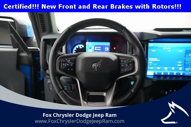 New Front and Rear Brakes with Rotors! CARFAX One-Owner. Certified. Velocity Blue Metallic 2021 Ford Bronco Outer Banks 4WD 12" LCD Capacitive Touchscreen w/Swipe Capability, 18" Bright Machined Aluminum Wheels, 2 Smart Charging USB Ports In Dashboard, 3.73 Axle Ratio, 360-Degree Camera, ABS brakes, Adaptive Cruise Control, Additional Sound Deadening, Air Conditioning, Auto High-beam Headlights, Compass, Connected Built-In Navigation, Equipment Group 314A Lux Package, Evasive Steering Assist, Forward Sensing System, Front Bucket Seats, Fully automatic headlights, Heated Rearview Mirrors, Heated Steering Wheel, Illuminated entry, Information on Demand Panel, Low tire pressure warning, Radio: B&O Sound System by Bang & Olufsen, Rear-View Camera, Remote Keyless Entry, Sideview Mirrors, Speed control, Steering Wheel Mounted Audio Controls, Traction Control, Universal Garage Door Opener, Wireless Charging Pad. When you buy your pre-owned vehicle from Fox Motors in Grand Rapids, you're choosing a dealership backed by more than 25 years of trusted service throughout Michigan. We take pride in every vehicle we sell, ensuring we never have to apologize for its condition. Each one is carefully inspected and reconditioned—and if it needs tires, factory brakes, or fresh fluids, filters, and wipers, we make sure they're replaced before it ever reaches our lot. Your ownership experience should start with confidence, not a repair bill. Reach out today and experience the Fox difference—because at Fox Motors, Fox Cares!