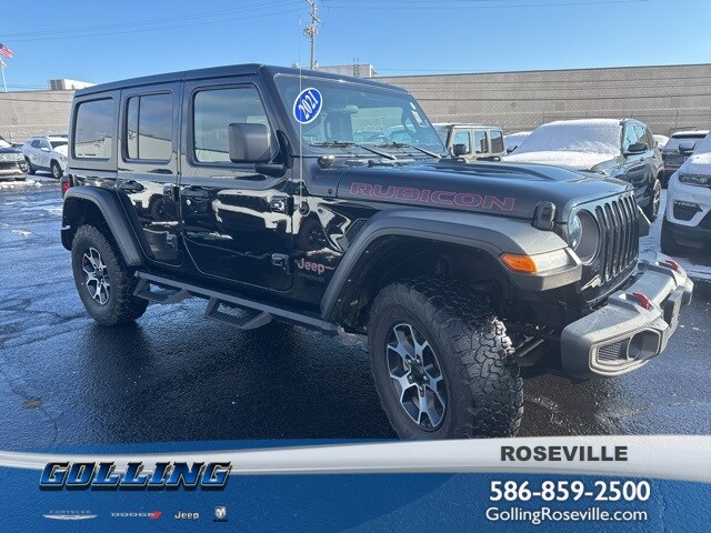 Certified. Priced below KBB Fair Purchase Price! Clean Carfax. Golling Chrysler Dodge Jeep Ram of Roseville is very proud to offer this 2021 Jeep Wrangler Unlimited Rubicon in Black Clearcoat with Black Cloth. This Wrangler is very well equipped with dealer maintained, local trade, accident free Carfax, low miles, and certified pre-owned. Golling Chrysler Dodge Jeep Ram of Roseville is very proud to offer this 2021 Jeep Wrangler Unlimited Rubicon in Black Clearcoat with Black Cloth.