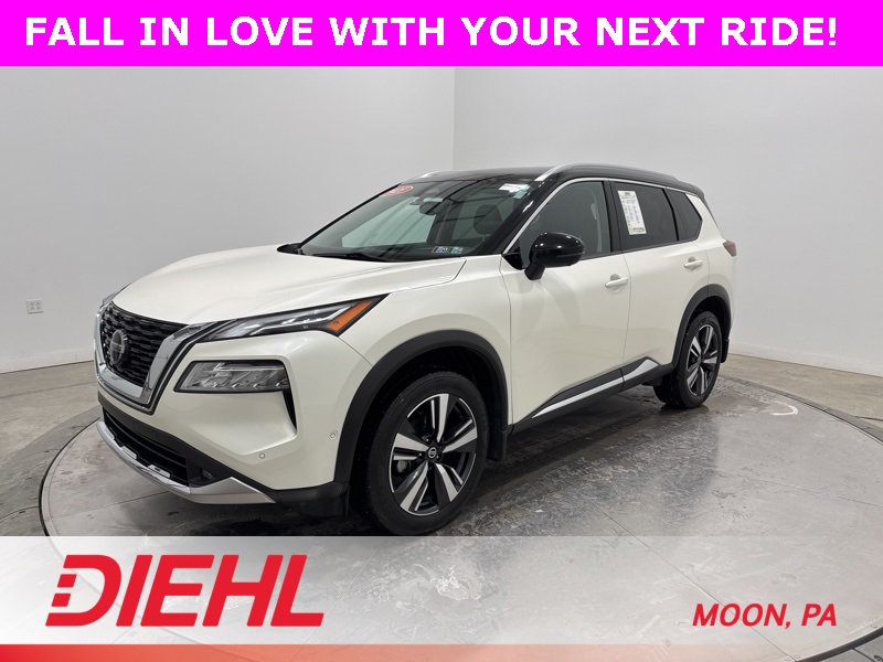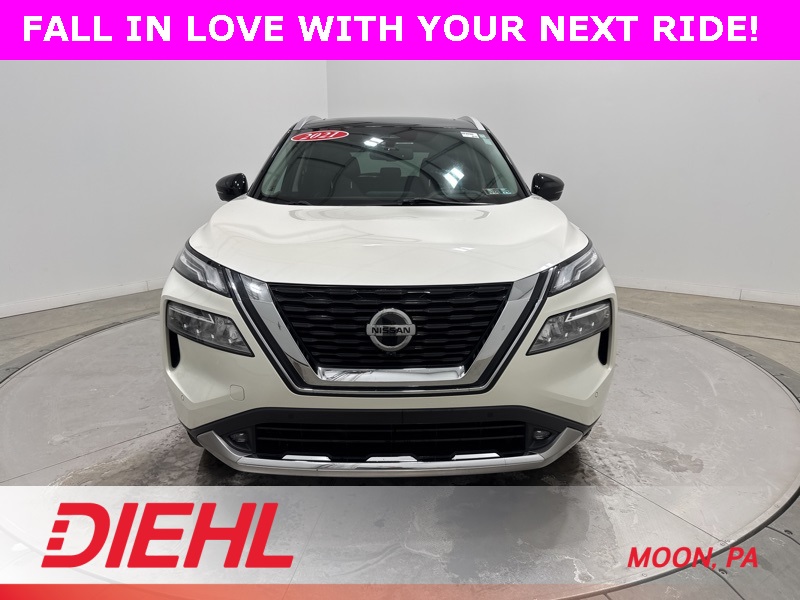 Some SUVs show up ready to impress, and this 2021 Nissan Rogue Platinum AWD arrived wearing its top trim confidence proudly and backed by real all wheel drive capability. This 2021 Nissan Rogue Platinum AWD delivers a smooth, confident ride powered by a responsive 2.5L engine and intelligent all wheel drive that adjusts as conditions change. It feels composed on the highway, secure in bad weather, and easy to live with every single day. The Platinum trim brings elevated style with LED lighting, sharp exterior accents, and a power panoramic moonroof that adds light and openness to every drive. Inside, this 2021 Nissan Rogue Platinum AWD leans heavily into comfort and technology. Quilted leather appointed seating, heated front and rear seats, and a heated steering wheel make cold mornings far more enjoyable. The digital dash and head up display keep important information right where you want it, while the large touchscreen pairs with navigation, wireless Apple CarPlay, Android Auto, and a premium Bose audio system that sounds as good as it looks. A power liftgate, remote start, and tri zone automatic climate control round out a cabin built for everyday convenience. Safety and driver assistance are front and center with ProPILOT Assist, intelligent cruise control, blind spot warning, rear cross traffic alert, lane departure warning, and a surround view monitor that makes tight parking spots much less stressful. This Rogue works hard to keep you comfortable and confident behind the wheel. Best of all, this vehicle is Diversified Certified, giving you added peace of mind with a 3 month 3,000 mile Extended Care Limited Warranty, a 125 point inspection, 24 hour roadside assistance, and a vehicle history report. Diversified Certified mirrors the coverage structure of Stellantis Certified GO while delivering dependable protection you can trust. If you are looking for a well equipped, technology packed SUV that still feels refined and capable, this 2021 Nissan Rogue Platinum AWD checks all the right boxes. Find it today at Diehl of Moon Twp before someone else claims it.