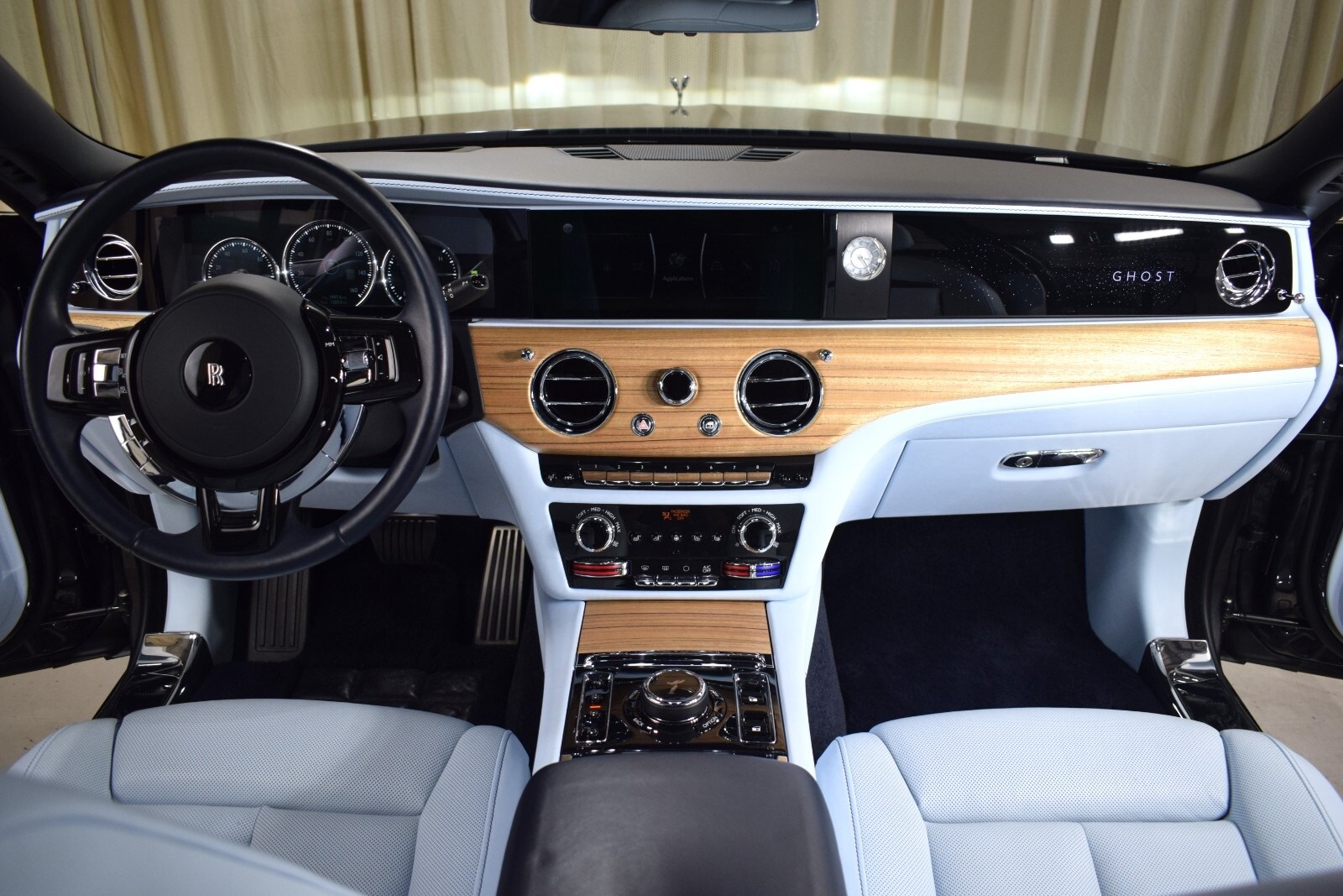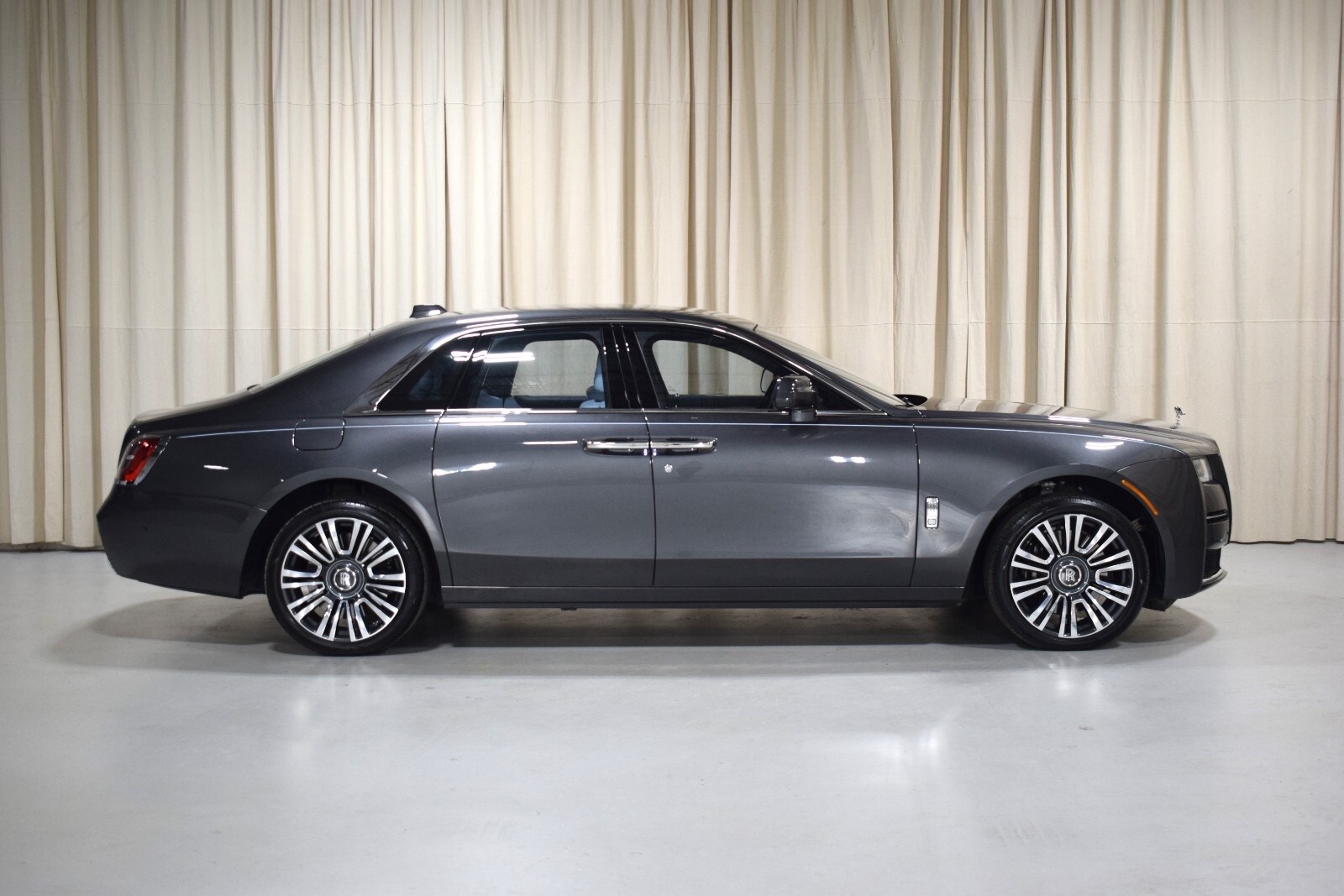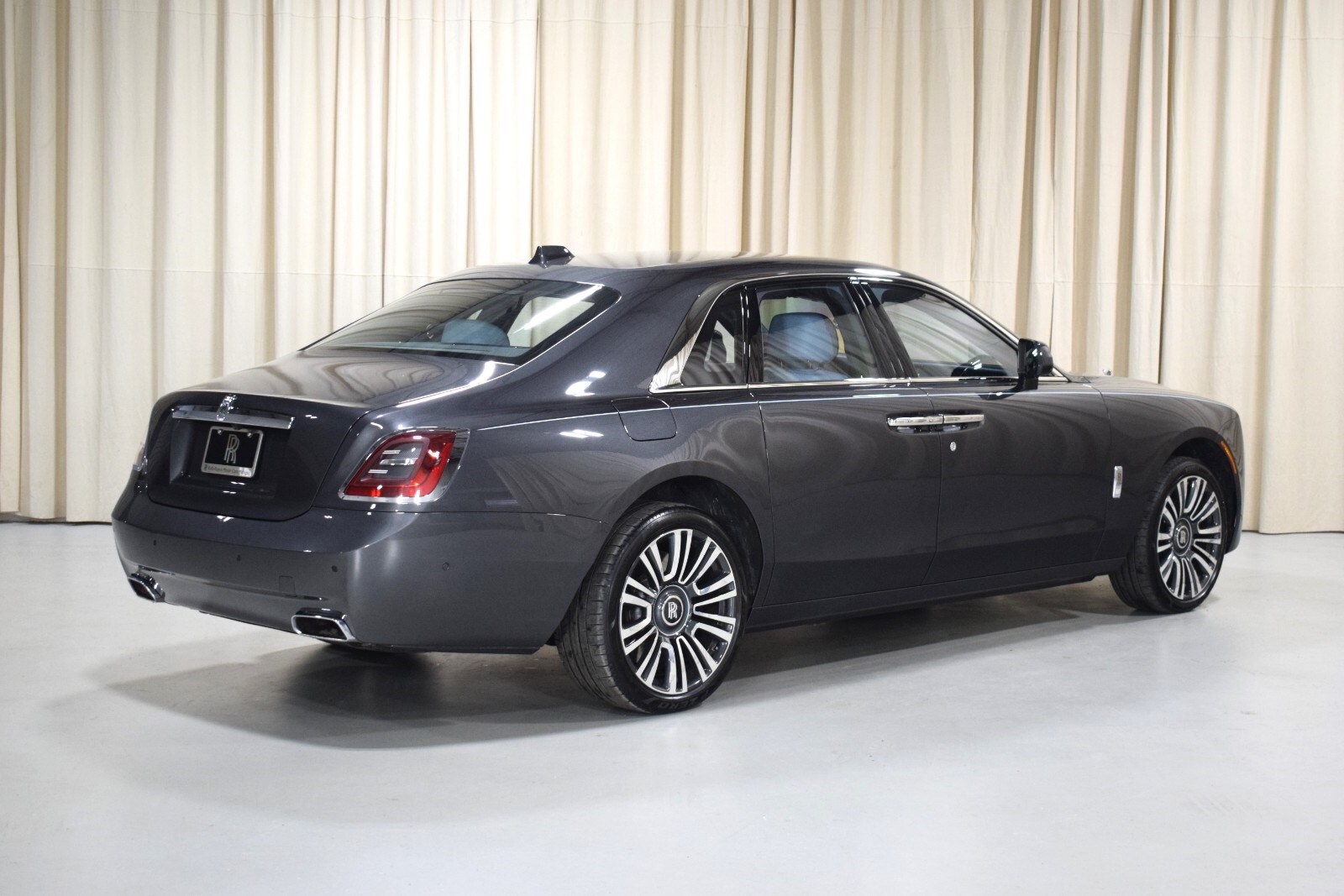 2021 Rolls-Royce Ghost in Gunmetal Metallic exterior with Charles Blue interior. The Rolls-Royce Ghost features a 6.75L V12 Twin Turbo engine with 563bhp.
