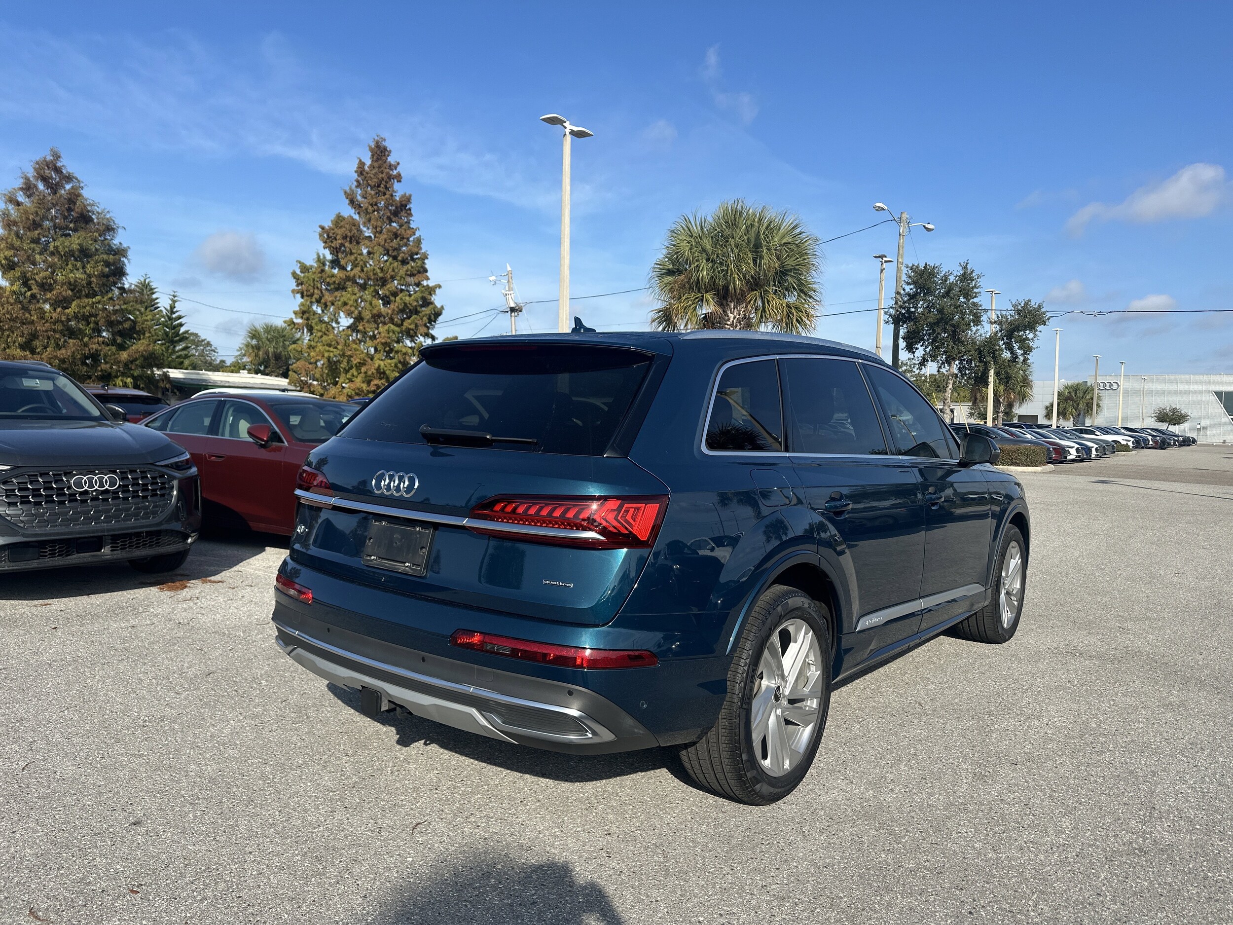 This Audi Certified 2022 Q7 55 TFSI offers luxury, space, and technology in a beautifully equipped 7-passenger SUV. Finished in Galaxy Blue Metallic with an upscale Okapi Brown interior, it features a 3.0L TFSI V6, quattro all-wheel drive, and smooth 8-speed Tiptronic performance. The Premium Plus Package adds Bang & Olufsen 3D audio, Adaptive Cruise Assist with lane guidance, top-view camera system, convenience package features, and 20" 5-spoke turbine wheels. The Executive Package enhances comfort with multicolor ambient lighting, extended leather, four-zone climate control, heated rear seats, ventilated front seats, sunshades, and upgraded passenger lumbar. With the Towing Package, panoramic sunroof, power-folding 3rd row, and Audi Virtual Cockpit Plus, this Q7 is fully equipped for family, travel, and daily comfort. A premium, fully optioned Q7 with the certification benefits and luxury features todays buyers want.