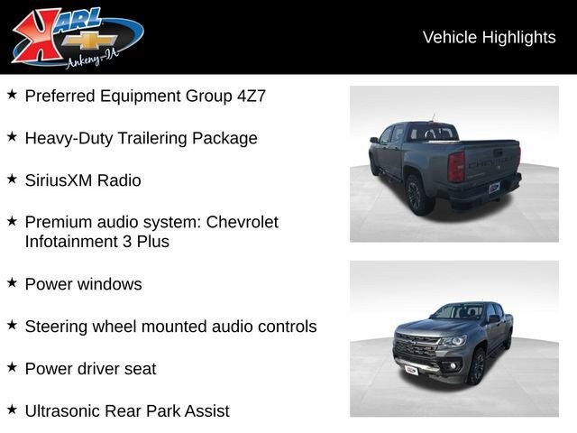 Recent Arrival! Carfax One Owner, Local Trade & Sold New at Karls! Certified. Steel Metallic 2022 Chevrolet Colorado Z71 4WD Crew Cab 128 Z7 V6 4WD, Apple CarPlay/Android Auto, Exterior Parking Camera Rear, Front Bucket Seats, Fully automatic headlights, Heated steering wheel, Heavy-Duty Trailering Package, Hitch Guidance, Integrated Trailer Brake Controller, Power Driver Lumbar Control Seat Adjuster, Power driver seat, Power windows, Preferred Equipment Group 4Z7, Premium audio system: Chevrolet Infotainment 3 Plus, SiriusXM Radio, Steering wheel mounted audio controls, Tow/Haul Mode, Ultrasonic Rear Park Assist, Wireless Charging for Compatible Cell Phones. 17/24 City/Highway MPG 8-Speed Automatic 4WD. At Karl Chevrolet we want to help you find the best new or used car in Ankeny that suits your needs. Check out the 2022 Chevrolet Colorado For Sale in Ankeny, IA. When you buy a new car at Karl Chevrolet you know you're finding a vehicle you can rely on. We have a great selection of Platinum Quality Pre-Owned Vehicles. We also pride ourselves in creating a friendly atmosphere and reliable new car dealership that you can trust. Call us with any questions about our 2022 Chevrolet Colorado and our experts will be glad to help you!