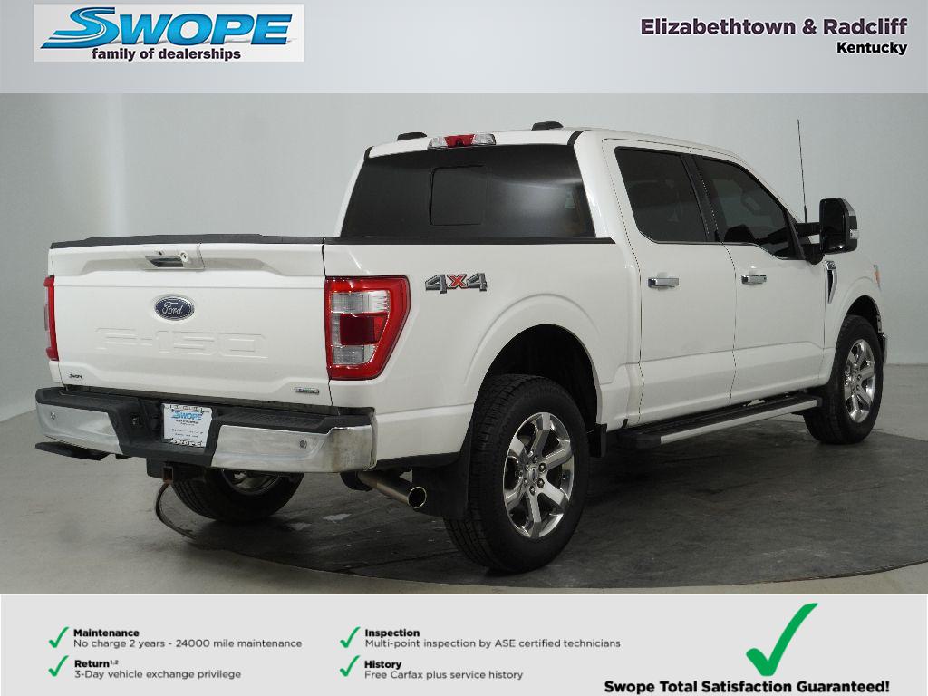 Peace of Mind with Ford Blue Certified Pre-Owned! Welcome to Bob Swope Ford's exclusive listing of pre-owned vehicles. Call 270-737-1000 to speak to one of our certified Product Specialist to discover all this vehicle has to offer and see why we are a different dealership. Check out all our vehicles online at bobswopeford.com. This Ford Blue Certified F-150 Lariat SuperCrew 4WD has been well maintained and comes equipped with leather, power and heated/ventilated front seats, Trailer Tow pkg. w/integrated trailer brake controller, 3.55 electronic locking rear axle, Adaptive Cruise Control, Lane Keep Assist, Blind Spot Info System w/cross traffic alert, Navigation, wireless charge pad, interior work surface, 36 gallon fuel tank, FordPass Connect, SYNC4 w/ 12" color touchscreen, rear view camera w/reverse sensing, remote start, power adjustable pedals, dual zone auto climate control, Chrome Package, B&O premium audio with 8 speakers, under rear seat lockable storage, auto headlamps w/auto high beam, LED fog lamps, zone lighting, 20" chrome like PVD wheels and much more. Ford's used Blue Certification provides 3-months/4,000 miles of comprehensive coverage to give you peace of mind about your purchase. See dealer for details.
