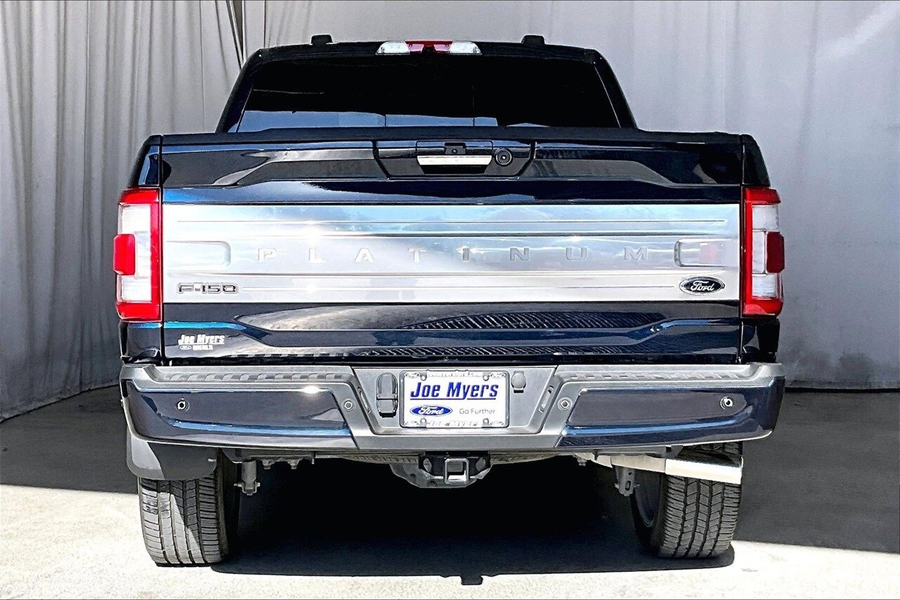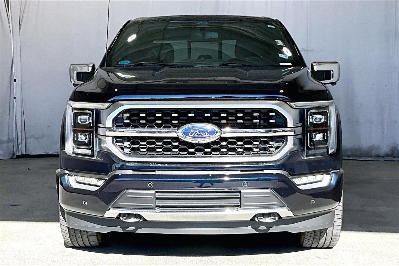 Clean Carfax, Non-Smoker, Local Trade, Leather, One Owner, Certified, Sunroof / Moonroof, Navigation / Navi / GPS, Rear View Camera, Bluetooth, 360 Degree Camera, Active Park Assist 2.0, Auto High-beam Headlights, Bed Utility Package, BlueCruise, BoxLink, Brake assist, Delay-off headlights, Electronic Stability Control, Equipment Group 701A High, Exterior Parking Camera Rear, Ford Co-Pilot360 Active 2.0, Front fog lights, Fully automatic headlights, LED Box Lighting, Memory seat, Pedal memory, Power driver seat, Power steering, Power Tailgate, Power windows, Pro Trailer Backup Assist, Radio: B&O Unleashed Sound System by Bang & Olufsen, Remote keyless entry, Steering wheel memory, Steering wheel mounted audio controls, Tailgate Step w/Tailgate Work Surface, Tow Technology Package, Twin Panel Moonroof. CARFAX One-Owner. Certified. Ford Gold Certified Details: 172 Point Inspection, Limited Warranty: 12 Month/12,000 Mile (whichever comes first) after new car warranty expires or from certified purchase date, Warranty Deductible: $100, Roadside Assistance, and 22,000 FordPass Rewards Points to use toward first two maintenance visits. Transferable Warranty. Vehicle History. Powertrain Limited Warranty: 84 Month/100,000 Mile (whichever comes first) from original in-service date. Clean CARFAX. Odometer is 34358 miles below market average! Recent Arrival! Antimatter Blue Metallic 2022 Ford F-150 Platinum 4WD 10-Speed Automatic 5.0L V8.