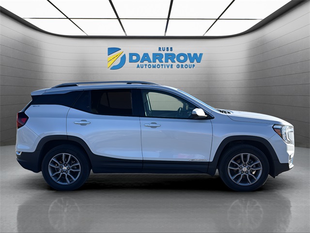 2022 GMC Terrain SLT White Frost Tricoat AWD 1.5L DOHC. Recent Arrival! Clean CARFAX. CARFAX One Owner. Sunroof/moonroof lets in natural light and fresh air. Advanced safety tech: adaptive cruise control, blind spot monitor, rear parking aid, and cross-traffic alert. White Frost Tricoat premium exterior paint. Integrated WiFi hotspot and telematics system. Heated front seats and heated power mirrors. Heads-up display for easy viewing of driving info. Backup camera plus aerial view display system. Driver seat and mirror memory presets for two drivers. Multi-zone automatic climate control keeps everyone comfortable. Keyless entry and remote start for convenience. Power liftgate for easy access to cargo. Fog lamps and LED headlamps with signature C-shaped lighting. Aluminum wheels and all-season tires for year-round reliability. Premium sound with satellite radio, MP3, and auxiliary input. Steering wheel audio and phone controls. 1.5L turbo engine with all-wheel drive and 9-speed automatic transmission. Electronic precision shifter and stop-start system for efficiency. Auto-dimming rearview mirror reduces glare. Laminated glass and privacy glass for noise reduction and comfort.