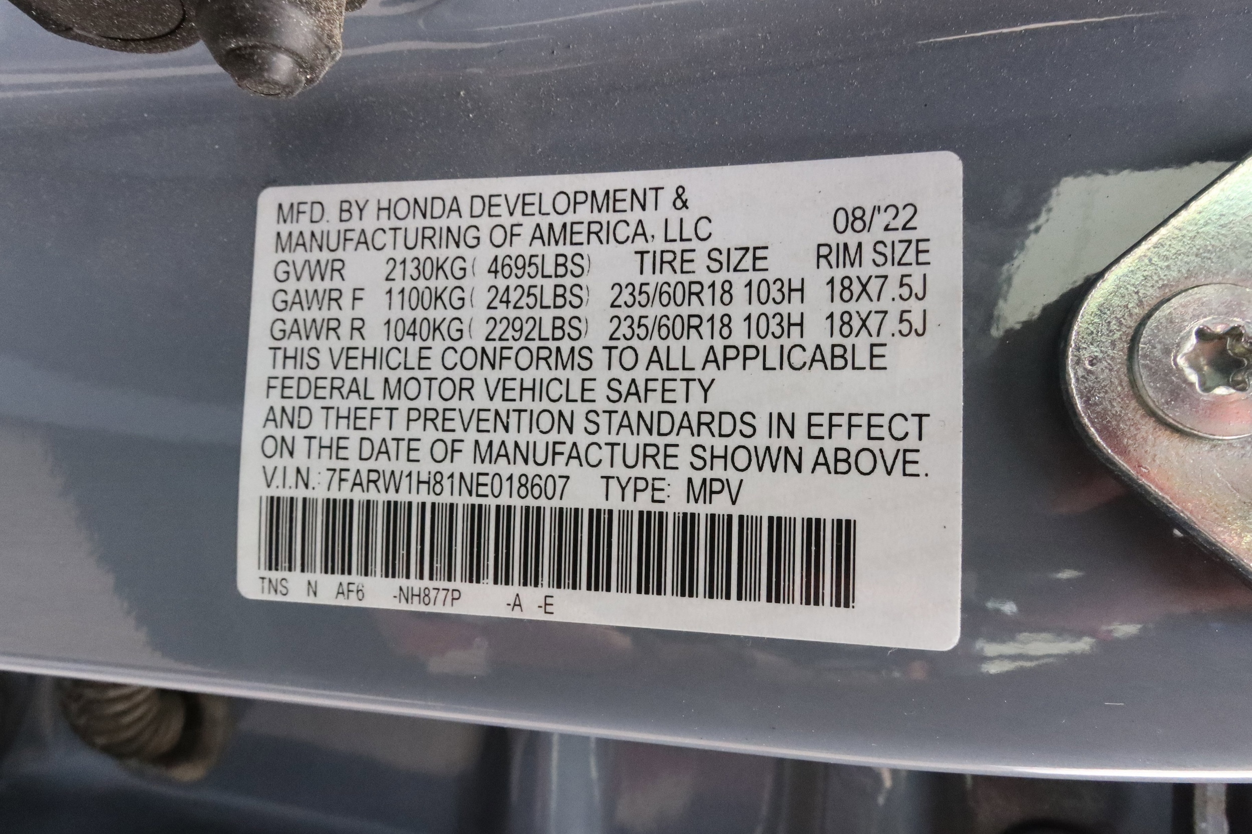 VIN: 7FARW1H81NE018607