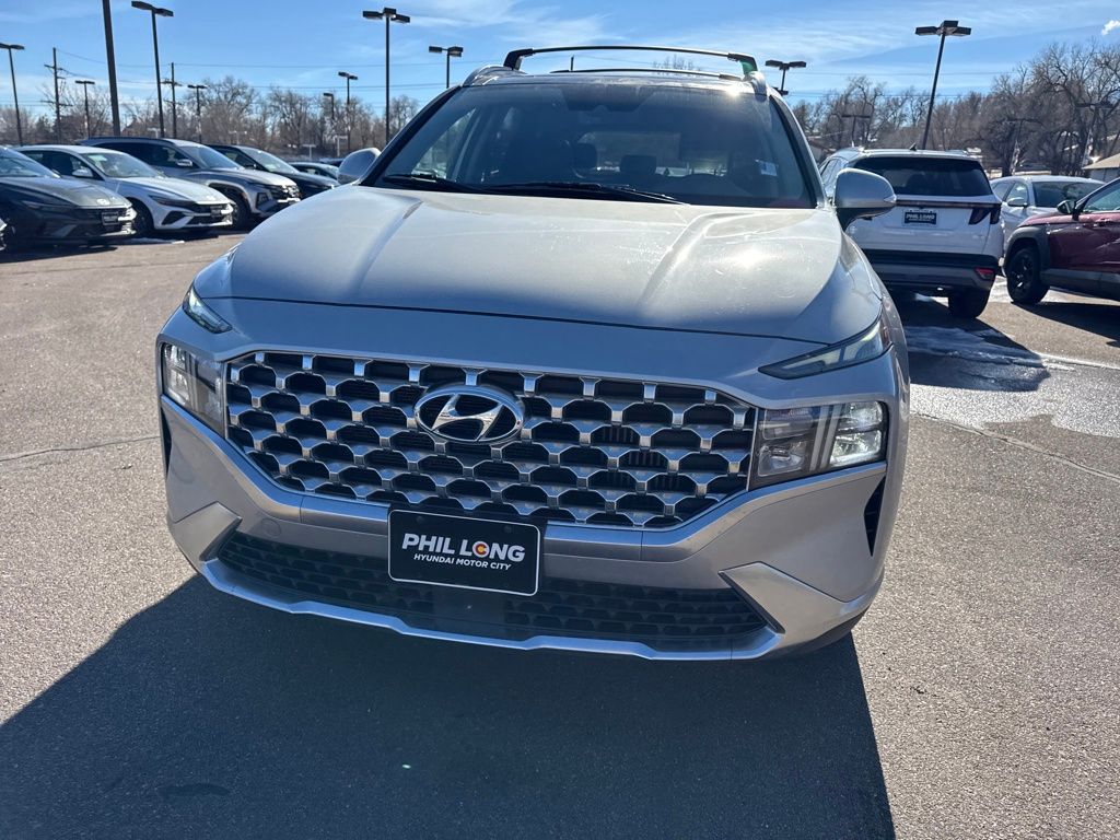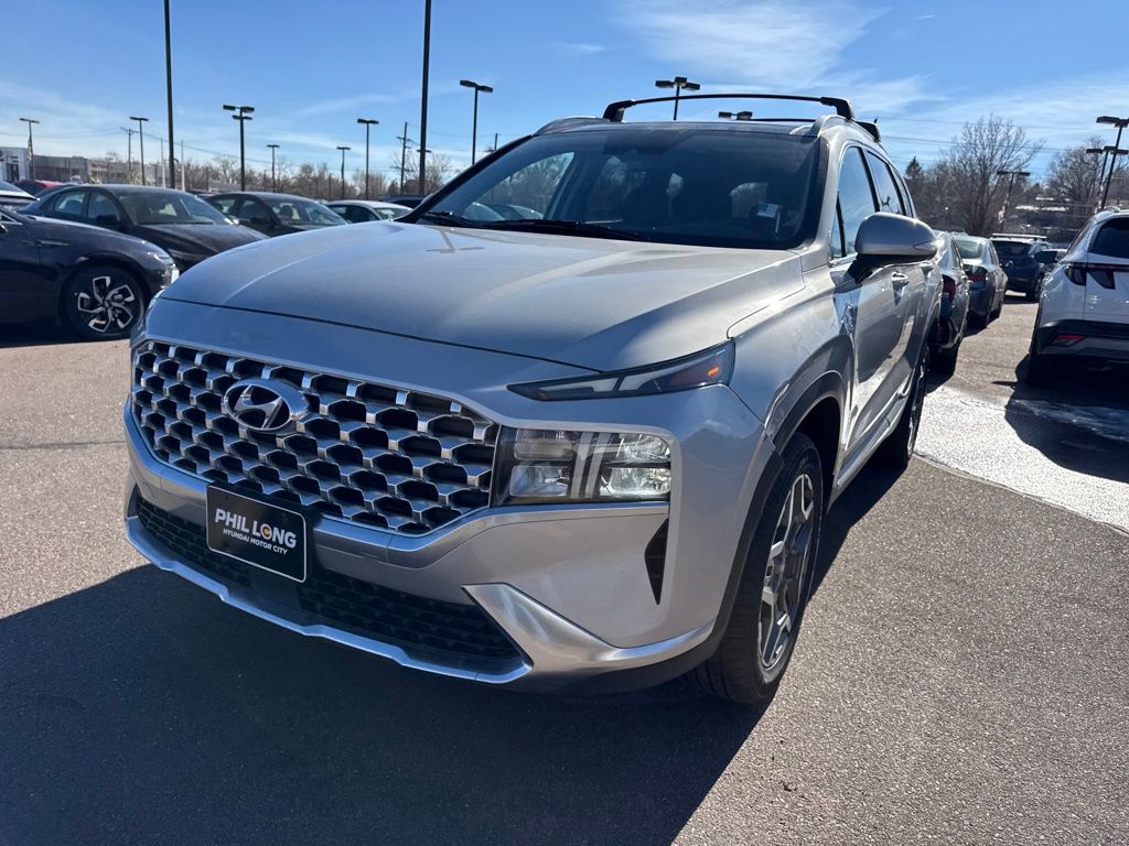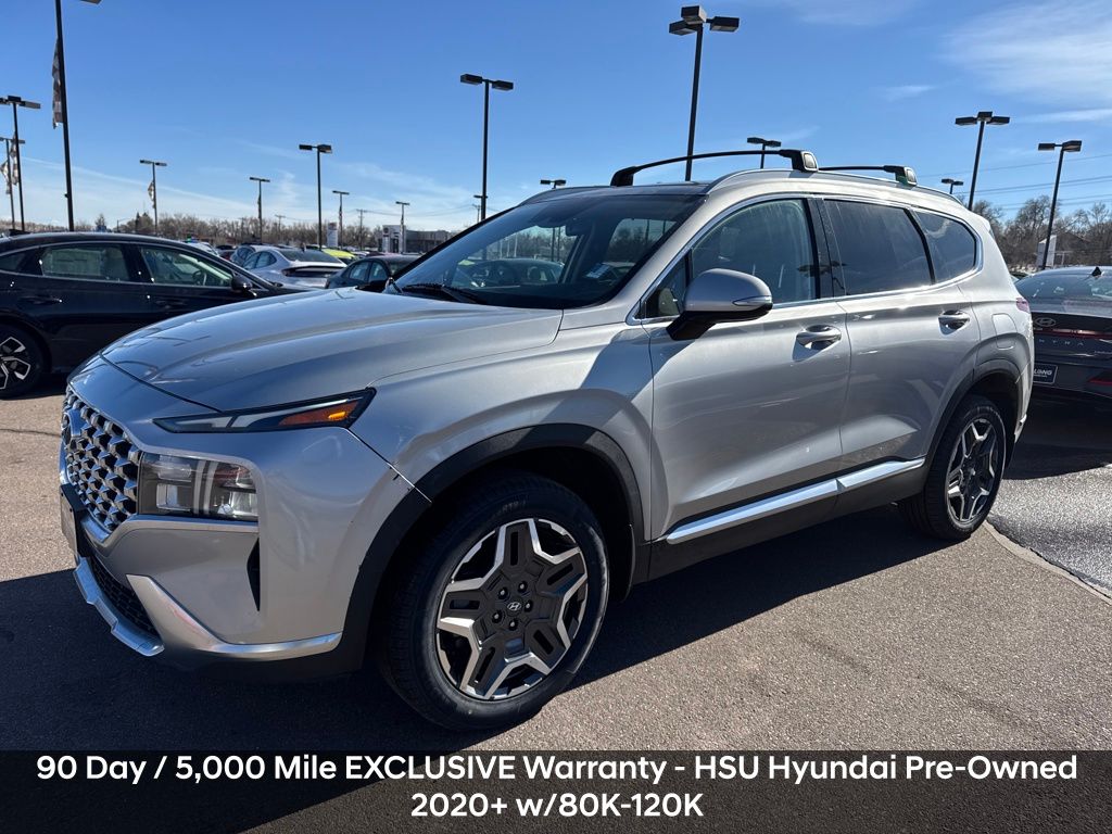 Recent Arrival! Always over 1,000 Pre-Owned in stock! No Payments for 90 days! 90 Day / 5,000 Mile EXCLUSIVE Warranty - HSU Hyundai Pre-Owned 2020+ w/80K-120K, I4. Clean CARFAX. Certified. Shimmering Silver 2022 Hyundai Santa Fe Hybrid SEL Premium AWD 6-Speed Automatic with Shiftronic I4 33/30 City/Highway MPG Hyundai Select Used Details: 117 Point Inspection, 6 Model Years Old and Newer With 80,000 - 120,000 Miles, 7-10 Model Years Old Vehicles With 120,000 Miles or Less. Powertrain Warranty 90 Days/5,000 Miles, HEV/PHEV Battery Warranty 10 Years/100,000 Miles. Roadside Assistance 90 Days/Unlimited Miles. Rental Car $35/Day Up to 5 Days. 3-Months SiriusXM Trial Subscription. Cargo Package (Cargo Net, Cargo Tray, and First Aid Kit), Option Group 01, Hyundai Select Used Certified, I4, 12 Speakers, 3.510 Axle Ratio, 4-Wheel Disc Brakes, ABS brakes, Air Conditioning, Alloy wheels, AM/FM radio: SiriusXM, Apple CarPlay & Android Auto, Auto High-beam Headlights, Auto-dimming Rear-View mirror, Automatic temperature control, Brake assist, Bumper Applique, Bumpers: body-color, Carpeted Floor Mats, Delay-off headlights, Driver door bin, Driver vanity mirror, Dual front impact airbags, Dual front side impact airbags, Electronic Stability Control, Emergency communication system, Exterior Parking Camera Rear, Four wheel independent suspension, Front anti-roll bar, Front Bucket Seats, Front Center Armrest, Front dual zone A/C, Front reading lights, Fully automatic headlights, Garage door transmitter: HomeLink, harman/kardon Speakers, Heated door mirrors, Heated Front Bucket Seats, Heated front seats, Illuminated entry, Leather Seat Trim, Leather steering wheel, Low tire pressure warning, Mudguards, Navigation System, Occupant sensing airbag, Outside temperature display, Overhead airbag, Overhead console, Panic alarm, Passenger door bin, Passenger vanity mirror, Power door mirrors, Power driver seat, Power Liftgate, Power moonroof, Power passenger seat, Power steering, Power windows, Radio: AM/FM Harman Kardon Audio, Rear anti-roll bar, Rear seat center armrest, Rear window defroster, Rear window wiper, Remote keyless entry, Roof Rack Crossbars, Security system, Speed control, Speed-sensing steering, Split folding rear seat, Spoiler, Steering wheel mounted audio controls, Tachometer, Telescoping steering wheel, Tilt steering wheel, Traction control, Trip computer, Turn signal indicator mirrors, Variably intermittent wipers, and Wheels: 19" x 7.5J Alloy.
