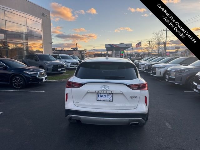 Lunar White 2022 Infiniti QX50 Luxe AWD I4 CVT AWD. Infiniti Certified Pre-Owned Warranty / CPO, remainder factory warranty. One owner, clean Car-Fax. Paddle shifters, Apple CarPlay / Android Auto, steering wheel audio controls, premium audio / MP3, Sirius/XM radio, smart entry system, universal garage door opener. Backup camera, all wheel drive, power moonroof / sunroof, driver & passenger power seats, heated seats, pushbutton start, remote keyless entry, remote start, dual zone auto climate control, auto/off headlights, Xenon headlights, high beam assist, power liftgate, rear parking sensors, lane departure warning, blind spot monitoring, rear automatic braking, rear cross traffic alert, power windows, power door locks, cruise control.