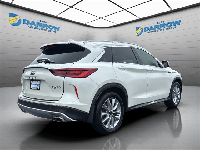 2022 Infiniti QX50 Luxe Majestic White AWD CVT I4. CARFAX One-Owner. Rear back-up camera with display, power sliding sunroof/moonroof, power liftgate, Bluetooth connection for mobile phone, Android Auto & Apple CarPlay, heated front seats, automatic temperature control, front dual zone A/C, power driver seat, remote keyless entry, steering wheel mounted audio controls. Certified. Certification Program Details: Certified Select. Includes exclusive membership status in the Russ Darrow Rewards Program. Earn points for every dollar spent on goods and services at any Russ Darrow location, plus extra points if purchasing packages with the Finance office. Use these points on your next new or used vehicle purchase at any Russ Darrow Dealership.