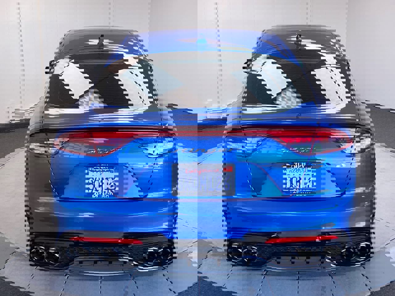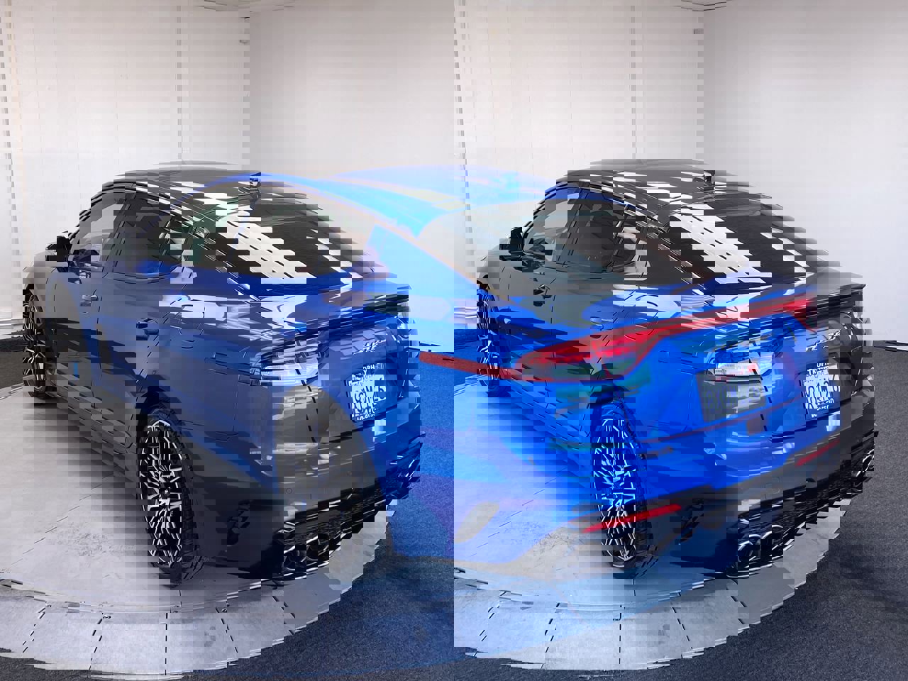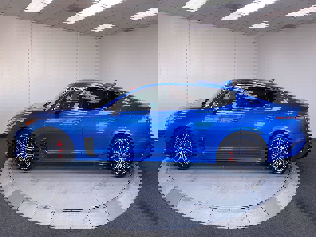 Micro Blue, carpeted floor mat, cargo tray, cargo net, black leather seat trim, wireless phone connectivity, wheels: 8.0J x 19 front/8.5J x 19 rear alloy, wheels with machined with painted accents, valet function. This Kia Stinger has a dependable twin turbo premium unleaded V-6 3.3 L/204 engine powering this automatic transmission.