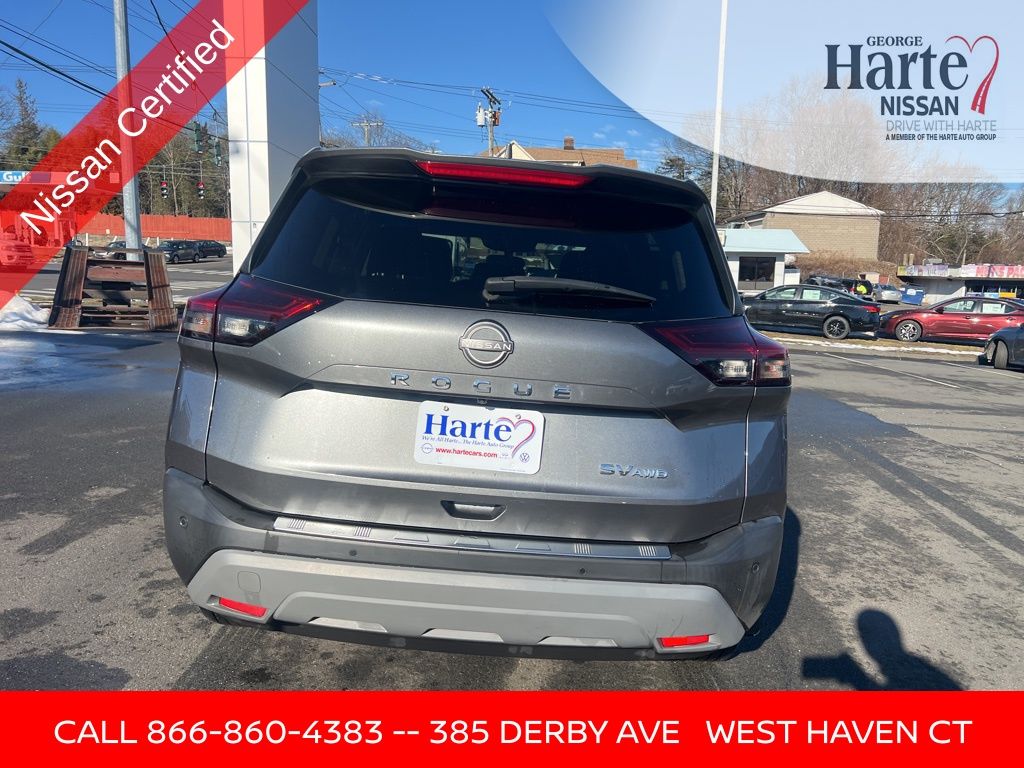 2022 Nissan Rogue SV AWD for Sale Near New Haven, CT. Certified AWD SUV • Premium Package • Comfort and Confidence in Fairfield County. Backed by Harte Certified Plus, this Rogue is an outstanding choice for Connecticut drivers who want a refined SUV with proven reliability. Finished in sleek Gun Metallic, this clean Carfax, local trade Nissan Rogue features the desirable SV Premium Package, elevating everyday driving with upscale touches and family-friendly versatility. Powered by Nissans advanced 1.5L turbocharged 3-cylinder engine producing 201 horsepower, paired with a CVT with Xtronic and intelligent all-wheel drive, the Rogue delivers smooth acceleration and confident traction while achieving an impressive 28 MPG city and 35 MPG highway. Inside, the Rogue SV offers a thoughtfully designed cabin with premium materials and modern technology. Highlights include heated leather seating, heated steering wheel, power driver seat, power panoramic moonroof, power liftgate, rear door sunshades, rear personal lights, and PRIMATEX leatherette seat trim with stitched door inserts. The spacious interior makes this Rogue ideal for commuting, road trips, and daily family life throughout New Haven County and beyond. Exterior details such as 18-inch aluminum alloy wheels and silver painted roof rails add both style and utility.