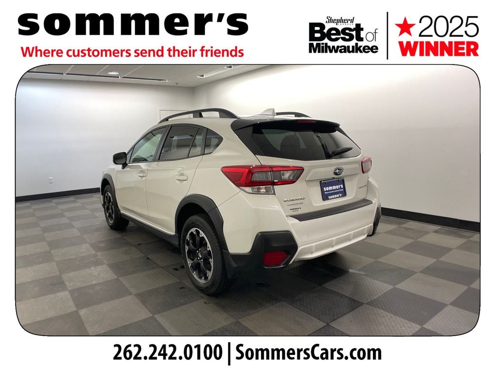 2022 Subaru Crosstrek Premium Certified Pre-Owned One Owner AWD with moonroof, heated front seats, power driver seat, EyeSight driver assist. The 2.0L Subaru Boxer engine, CVT, and full-time AWD deliver easy daily efficiency with steady traction when Wisconsin roads turn wet or slick. Heated front seats, a 6-way power driver's seat, and climate control make this Crosstrek comfortable for commuting and weekend travel. Keyless entry, a power moonroof, remote trunk release, and all-weather floor liners add everyday usefulness. Apple CarPlay, Android Auto, Bluetooth®, and smart device integration keep calls, music, and navigation apps close at hand. A backup camera, WiFi hotspot, telematics, and a universal garage door opener round out the cabin tech. Blind spot monitor, rear cross-traffic alert, adaptive cruise control, lane departure warning, and lane keeping assist help reduce stress in traffic. Front collision mitigation, driver monitoring, traction control, stability control, and a full airbag setup support everyday confidence. Crystal White Pearl paint, aluminum wheels, fog lamps, automatic headlights, heated mirrors, black wheel-arch cladding, and a rear spoiler give this Crosstrek a clean rugged look. Inside, black cloth upholstery with orange stitching, a leather-wrapped steering wheel, cargo shade, rear seatback protector, rear bumper cover, and splash guards add style and function. Easy to park, efficient to run, and comfortable enough for daily miles or weekend getaways.