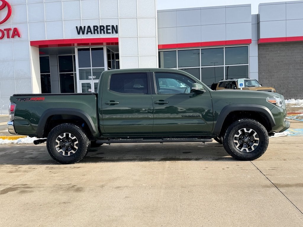BOUGHT HERE NEW, SERVICED HERE, 4X4, CERTIFIED, CLEAN CARFAX ONE OWNER, ALLOY/CHROME WHEELS, NON -SMOKER, Bluetooth®, ULTRA LOW MILES, "Easy Price... One Low Price, Every Vehicle...Every Day !", 4WD, 120V/400W Deck Mounted AC Power, Black Chrome Exhaust Tip (TMS), Black Out Package (TMS), Black Overfenders, Blackout Emblem Overlays (TMS), Engine Immobilizer, Power Sliding Rear Window with Privacy Glass, Smart Key with Push Button Start, Tailgate Emblem (TMS), TRD Off Road Package. Recent Arrival! CARFAX One-Owner. TRD Off Road Package. Army Green 2022 Toyota Tacoma TRD Off-Road V6 V6Toyota Gold Certified Details: Transferable Warranty, Powertrain Limited Warranty: 84 Month/100,000 Mile from TCUV purchase date, Roadside Assistance for 7 Year / 100,000 Mile. Standard New-Car Financing Rates Available. Warranty honored at over 1,400 Toyota dealers in the continental U.S. & Canada. Trade-ins accepted. Trouble-free handling of your transaction, including DMV paperwork. At Toyota of Warren, we are transforming the dealership experience. Our Easy Pricing ensures a hassle-free process no pressure, no gimmicks just transparent, market-based pricing from the start, giving you complete confidence while you shop. We pride ourselves on providing a quick, simple and easy process. We study the live market daily to ensure that our pre-owned vehicles are priced aggressively based on color, equipment, condition and miles. You will get our Best Price, In the quickest time, with no hassles. Allow us to serve you by embracing technology to bring the car to you when you cannot physically be here, arranging for vehicle shipping to your doorstep, and ensuring that you're completely satisfied with your pre-owned vehicle purchase.
