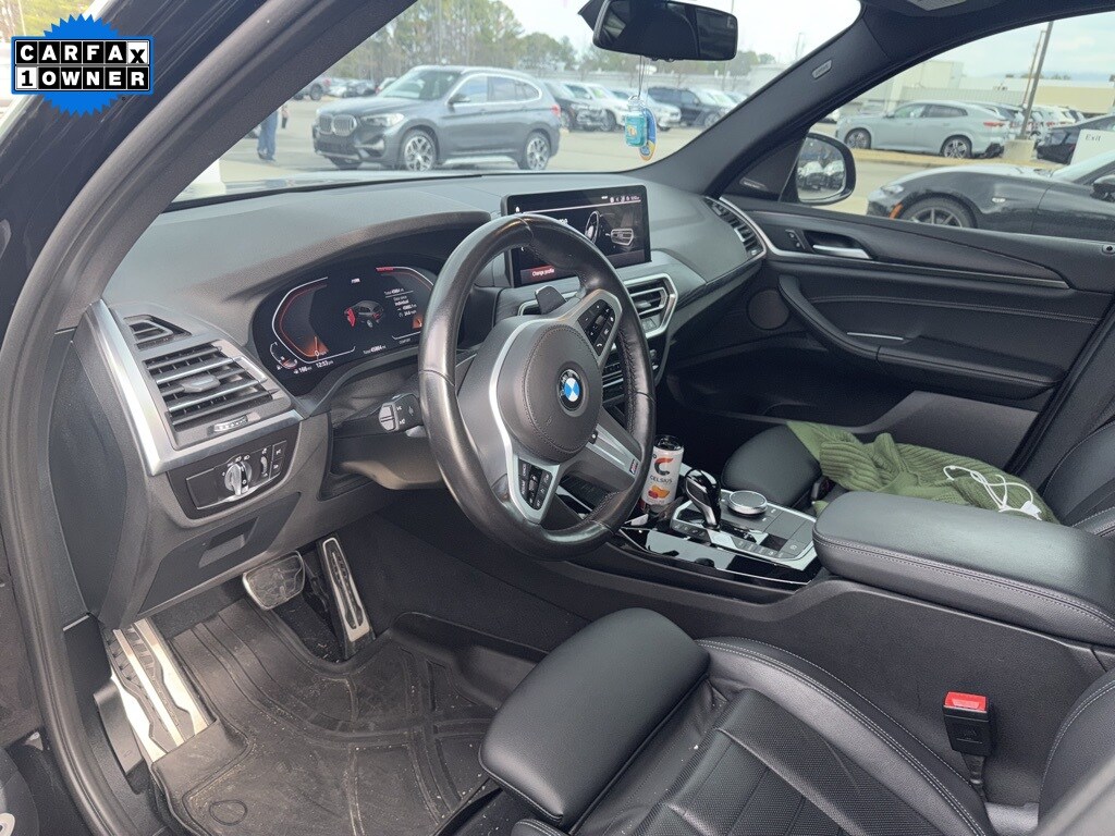 2023 BMW X3 xDrive30i AWD. One Owner Trade In, One Owner, Non-Smoker, Clean CarFax Report, Local Trade In, All-Wheel Drive, X-Drive. Active Park Distance Control, Aerodynamic Kit, Driver Lumbar Support, Extended Shadowline Trim, Front Ventilated Seats, harman/kardon Surround Sound System, Heated Front Seats, Heated Steering Wheel, Live Cockpit Pro w/Navigation, Lumbar Support, M Shadowline Lights, M Sport Package, M Steering Wheel, Panoramic Moonroof, Parking Assistance Package, Parking Assistant Plus, Premium Package, Rear-View Camera, Remote Engine Start, Roof Rails in High-Gloss Shadowline, Shadowline Exterior Trim, Shadowline Package, Smoke Grey Aluminum Rhombicle Trim, Surround View w/3D View, Trailer Hitch, Wheels: 19" x 7.5" M Y-Spoke Bi-Color (Style 887M), Wheels: 21" x 8.5". The vehicle features a refined and comfortable interior with a powerful and efficient engine. The ride is quiet and composed, and the vehicle handles well in all conditions.