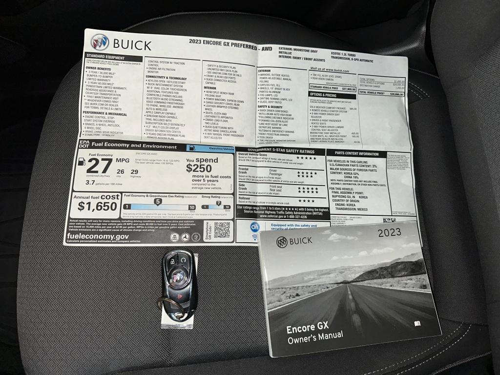 Buick Certified. Onboard Communications System, Satellite Radio, Back-Up Camera, All Wheel Drive, Turbo Charged, transmission, 9-speed automatic, 9T4X... Cold weather comfort package, engine, ECOTEC 1.3L Turbo, Alloy Wheels. Key features include All Wheel Drive, Back-Up Camera, Satellite Radio, Onboard Communications System, Aluminum Wheels Buick Preferred with Moonstone Gray Metallic exterior and Ebony with Ebony interior accents interior features a 3 Cylinder Engine with 155 HP at 5600 RPM. OPTION PACKAGES COLD WEATHER COMFORT PACKAGE includes (A2X) Driver 8-way power seat adjuster, (AL9) Driver two-way power lumbar control, (BTV) Remote Vehicle Starter System and (KA1) Heated driver and front passenger seats. REMOTE VEHICLE STARTER SYSTEM includes Remote Keyless Entry, AUDIO SYSTEM, 8" DIAGONAL BUICK INFOTAINMENT SYSTEM includes multi-touch display, AM/FM stereo, Bluetooth streaming audio for music and most phones and Wireless Apple CarPlay/Wireless Android Auto for compatible phones (STD), ENGINE, ECOTEC 1.3L TURBO (GM-estimated 155 hp [115 kW] @ 5,600 rpm / 174 lb-ft torque [236 Nm] @ 1,600 rpm FWD/AWD models) (STD), TRANSMISSION, 9-SPEED AUTOMATIC, 9T4X, GEN 1 (STD). SHOP WITH CONFIDENCE 172-Point Inspection and Reconditioning, Vehicle Exchange Program: 3 Day / 150 Mile Guarantee, $0 Deductible, Includes two maintenance visits as part of the Certified Pre-Owned Scheduled Maintenance Program, 3-month trial of the OnStar Safety & Security Plan and Connected Services, 6-Year/100,000-Mile Powertrain Limited Warranty, 24/7 Roadside Assistance, CarFax Vehicle History Report, 12-Month/12,000-Mile Bumper-to-Bumper Limited Warranty.