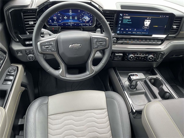 2023 Chevrolet Silverado 1500 ZR2 in Glacier Blue Metallic. Experience the pinnacle of off-road performance and luxury with this 2023 Chevrolet Silverado 1500 ZR2. This flagship truck is powered by the formidable EcoTec3 6.2L V8 engine, delivering massive torque and horsepower through a precision-tuned 10-speed automatic transmission and a robust 4WD system featuring an Auto-Locking Rear Differential for maximum traction. ZR2 Suspension Package designed for ultimate terrain mastery, this package features high-performance Multimatic DSSV dampers and increased ground clearance to handle the toughest trails while maintaining refined on-road manners. Technology Package upgrades your driving experience with a 15" Diagonal Multicolor Head-Up Display, providing vital stats on your windshield, and a Rear Camera Mirror for an unobstructed view behind the vehicle. HD Surround Vision and Bed View Camera navigate obstacles and provide a specialized camera to monitor the impact of the camera to monitor the cargo in the Chevytec Spray-On Black.