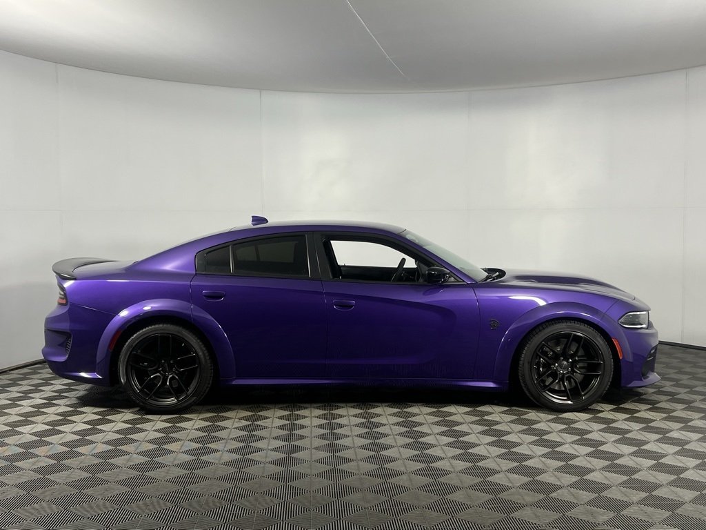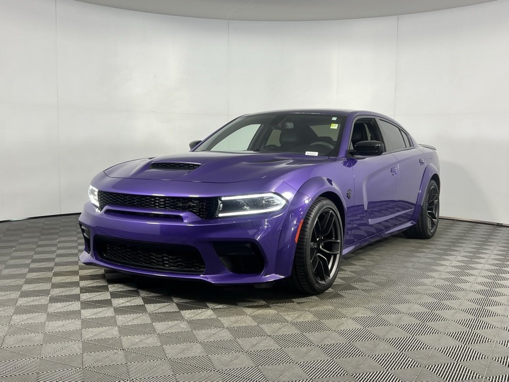 Bill Luke Certified! No hidden fees! All reconditioning costs are fully included in our prices. One owner! Low miles! Navigation and Travel Group, Harman/Kardon Audio Group, 8.4" touchscreen and 20" wheels! Unleash extreme performance and head-turning style with the 2023 Dodge Charger SRT Hellcat Widebody Jailbreak in rare Plum Crazy Pearlcoat, powered by a 6.2L Supercharged HEMI V8 engine delivering adrenaline-pumping horsepower to the rear wheels. This high-performance muscle car features the Quick Order Package 23B, Anti-Spin Differential Rear Axle, and advanced safety systems including Blind Spot Monitoring with Cross Path Detection and Rear Park Assist. Inside, enjoy premium comfort with black artificial leather, heated and ventilated front seats, heated rear seats, and a heated steering wheel. The 8.4" Uconnect 4C NAV touchscreen with Apple CarPlay, Android Auto, GPS Navigation, and 4G LTE Wi-Fi Hotspot keeps you connected, while the 19-speaker Harman/Kardon GreenEdge Surround Sound System delivers immersive audio. Additional highlights include the Jailbreak IP Badge, Midnight Metallic SRT Decklid Badge, dual bright exhaust tips, 2-piece shark fin antenna, and 20" wheels, making the 2023 Charger Hellcat Widebody a bold blend of muscle, luxury, and cutting-edge tech.