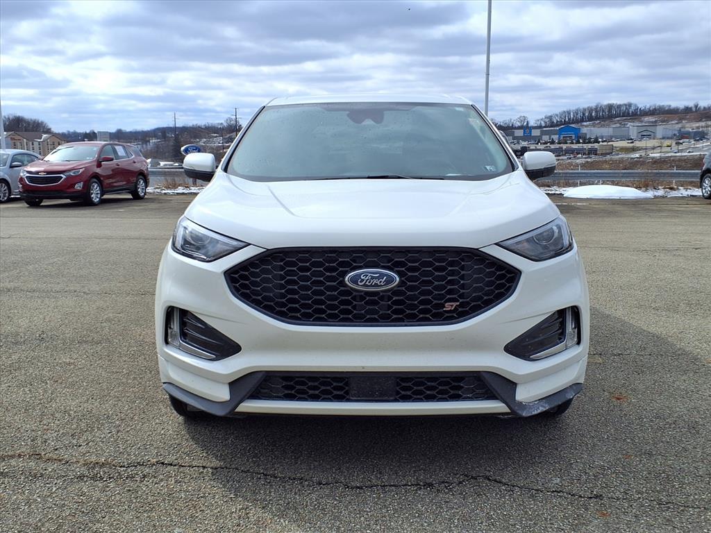 This vehicle is a 2023 Ford Edge ST, certified pre-owned with a star white metallic tri-coat exterior and ebony interior. It has driven 35,114 miles and is powered by a 2.7 liter EcoBoost Twin Turbo V6 335hp 380 lb-ft direct injection engine with all wheel drive. It has an impressive fuel economy rating of 19 mpg in the city and 25 mpg on the highway, making it an economical choice for any driver. The vehicle also boasts a crash test rating of 5 out of 5 stars, making it even safer for passengers. The carfax report is available for review, showing that it has been well maintained and has only been driven 35,114 miles. Features such as touch screen display, Bluetooth audio connection, blind spot sensor, hill start assist, on demand four wheel drive, Bluetooth phone connectivity, and leather-trimmed seats are all included in this vehicle to make your driving experience even more enjoyable.