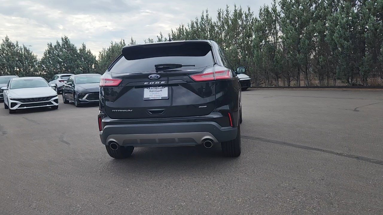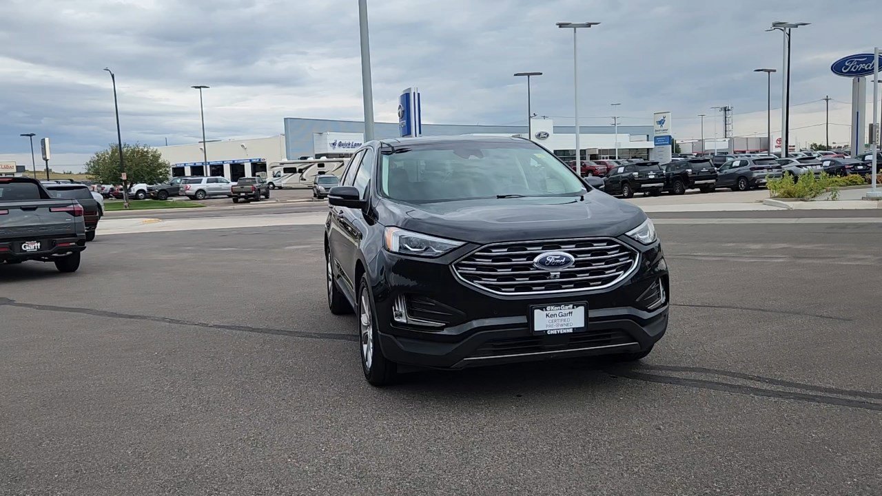 Refined design meets advanced technology in the 2023 Ford Edge Titanium AWD, finished in Agate Black Metallic with an Ebony interior. Powered by a twin-scroll 2.0L EcoBoost engine paired with an 8-speed automatic transmission, this SUV delivers responsive performance and efficiency. Intelligent All-Wheel Drive enhances traction in any condition, while Auto Start-Stop technology helps maximize fuel economy. Inside, the Titanium trim elevates every drive. Heated and cooled 10-way power driver and 6-way power passenger seats with memory, heated second-row seats, ambient lighting, and a heated leather-wrapped steering wheel provide premium comfort. A panoramic Vista Roof brings in natural light, while the B&O 12-speaker sound system creates a concert-like experience. Stay connected with a 12-inch SYNC 4A touchscreen featuring enhanced voice recognition, wireless Apple CarPlay and Android Auto, SiriusXM with 360L, Connected Built-In Navigation, and FordPass Connect with Wi-Fi hotspot. Convenience features like wireless charging, a universal garage door opener, 110V/150W power outlet, and hands-free power liftgate make daily life easier. Safety and driver-assist technology come standard with Ford Co-Pilot360, plus Adaptive Cruise Control with Stop-and-Go, Lane Centering, Evasive Steering Assist, front 180-degree camera, and rear parking sensors for extra confidence. The 2023 Ford Edge Titanium AWD combines modern luxury, smart technology, and all-weather capability. Visit Ken Garff in Cheyenne today to test drive the Edge Titanium and experience a midsize SUV that goes beyond expectations.