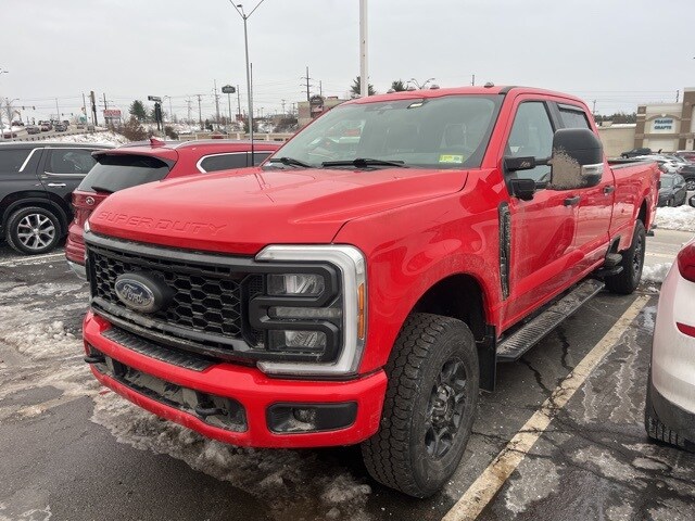 This 2023 Ford F-350 Super Duty XL 4WD in bold Race Red is built to handle the toughest jobs with confidence, powered by the formidable 7.3L V8 gas engine producing 405 horsepower. A CARFAX One-Owner truck with a Clean CARFAX, this heavy-duty pickup is Ford Gold Certified and equipped with the GVWR 11,800-lb Payload Package, electronic-locking rear axle with 3.73 ratio, and the FX4 Off-Road Package featuring off-road tuned shocks, hill descent control, skid plates, and a unique FX4 box decal. The STX Appearance Package enhances its commanding presence with 18" ebony black painted aluminum wheels, painted grille, body-color front and rear bumpers, LED fog lamps, and roof clearance lights. Engineered for serious work and advanced capability, this F-350 includes the 5th Wheel/Gooseneck Hitch Prep Package, Snow Plow Prep Package, Pro Power Onboard 2kW, and upfitter switches, making it an ideal choice for contractors and heavy haulers. Added confidence comes from the 360-Degree Camera Package, BLIS with cross-traffic alert, rear parking sensors, pre-collision assist and the XL driver assist. Interior comfort and convenience are enhanced with cloth 40/Console/40 seating.