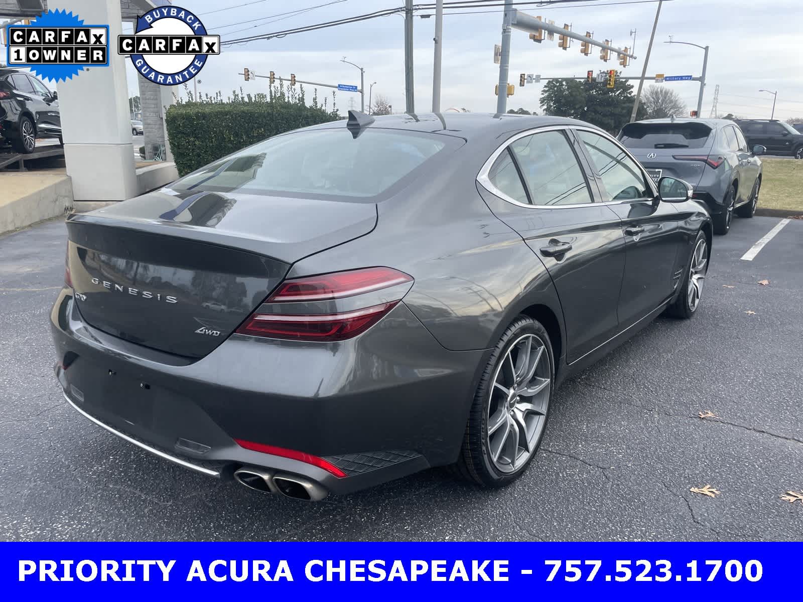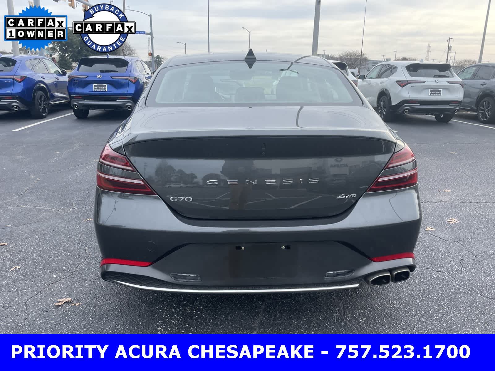 Makalu Gray 2023 Genesis G70 4D Sedan 2.0T I4 8-Speed Automatic with SHIFTRONIC AWD. Leather seats, Bluetooth, One Owner, Lifetime Powertrain Warranty. CARFAX One-Owner. 20/28 City/Highway MPG. Certified. Certification Program Details: Powertrain Guaranteed for LIFE. At Priority Acura Chesapeake we believe in Market Value Pricing for all vehicles in our inventory. We use real-time Internet price comparisons to constantly adjust prices to provide all buyers the best price possible. We utilize state-of-the-art technology to constantly monitor pricing trends in order to offer our shoppers the most competitive pricing and value.
