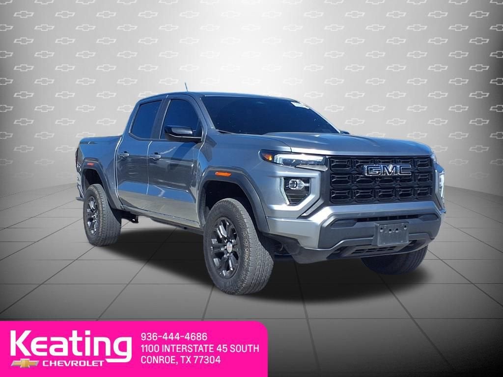 The 2023 GMC Canyon 2WD Elevation Crew Cab is a versatile midsize pickup with a Sterling Metallic exterior and Jet Black interior. It is powered by a 2.7L Turbo High-Output engine paired with an 8-speed automatic transmission and features an off-road suspension with all-terrain blackwall tires. Connectivity and technology are enhanced with an 11.3-inch diagonal GMC Premium Infotainment System with Google built-in, wireless Apple CarPlay, wireless Android Auto, 8-inch driver information center, rear seat reminder, steering wheel controls, keyless open and start, and cruise control. Safety is provided by Canyon Pro Safety with automatic emergency braking, forward collision alert, IntelliBeam auto high beams, front pedestrian and bicyclist alerting, following distance indicator, and HD rear vision camera. For more details, visit www.keatingchevrolet.com or call Keating Chevrolet at 936-286-4495.