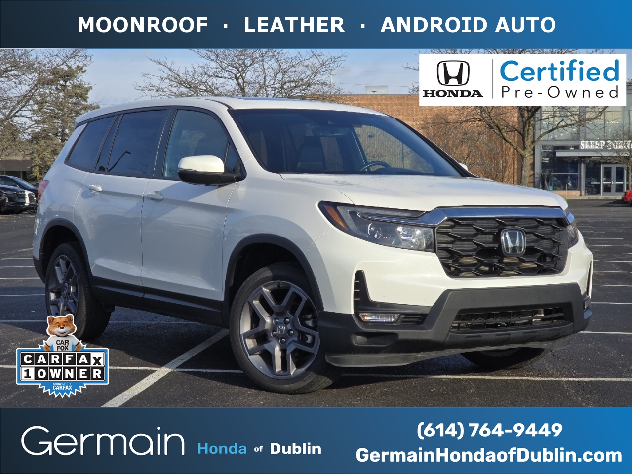 This popular Honda Certified 2023 Passport EX-L features leather, moonroof, heated seats, Apple CarPlay, Android Auto, alloy-wheels, Bluetooth, backup camera, SiriusXM, remote entry, and is available today at our Dublin, OH Honda dealership near you. This 2023 Honda Passport EX-L is available now from Germain Honda of Dublin and competitively priced at $31,397, which reflects an immediate savings of $2,828 off of market retail. This certified used 2023 all wheel drive Honda Passport EX-L sports a head-turning Platinum White Pearl exterior with a luxuriously-appointed Black leather interior and has only 22,990 miles. Stop by our Honda dealership near you today for a test drive! Certified Pre-Owned Honda: Choosing this Honda Certified 2023 Honda Passport EX-L gives you peace of mind. That's because every Honda Certified Pre-Owned Vehicle goes through a rigorous multi-point inspection completed by one of our factory-trained technicians. In addition, each vehicle sold comes with great Honda benefits including: a limited warranty for powertrain and non-powertrain coverage, roadside assistance, complimentary oil changes in the first year of ownership, a 3-day vehicle exchange policy, Honda Care, trip interruption, concierge service, vehicle inspection reports, and Sirius XM for the first 3 months. This Honda certified 2023 Passport passed a rigorous inspection of mechanical, electrical, and aesthetic details. For your safety and convenience, this vehicle comes fully detailed and sanitized. Warranties vary based on model year and mileage qualifications. See dealer for additional details.