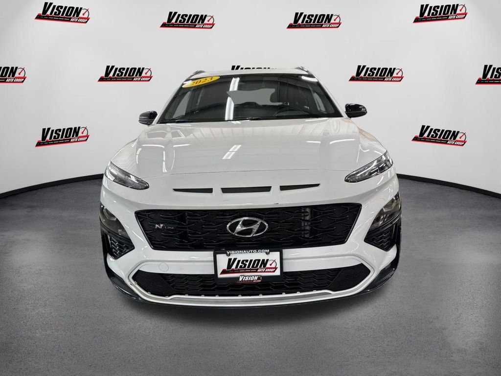 Unlock the power of the open road with the 2023 Hyundai Kona N Line. This dynamic crossover SUV is the perfect blend of style, performance, and cutting-edge technology, making it the ultimate companion for your adventures. Boasting a striking Lunar White exterior, the Kona N Line commands attention with its bold, aerodynamic design and 18-inch alloy wheels. Step inside and you'll be greeted by a host of premium features.
