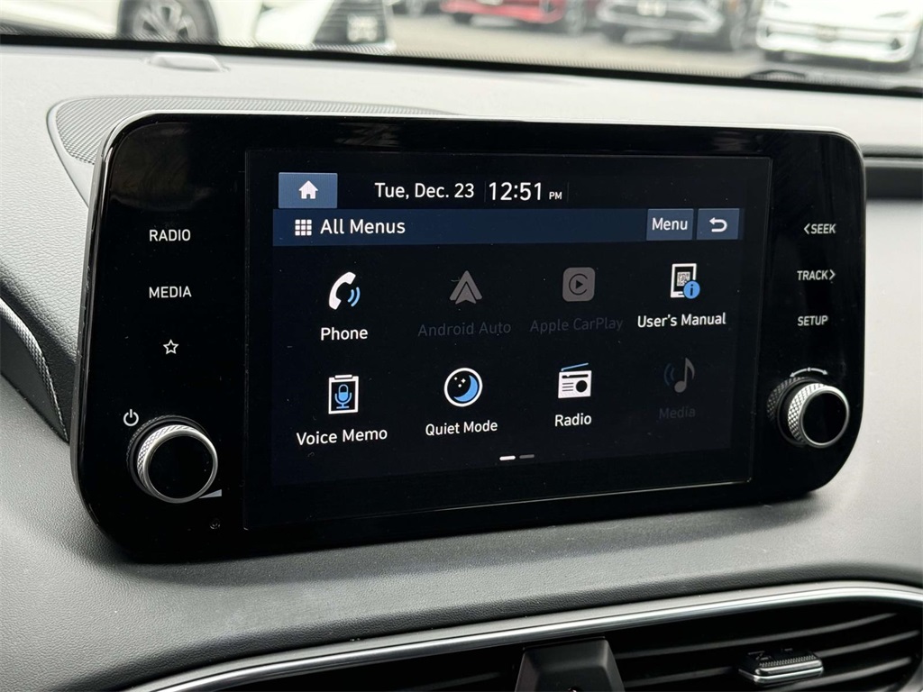 Hyundai Combined Details: Includes 10-year/Unlimited Mileage Roadside Assistance with Rental Car and Trip Interruption Reimbursement; Please See Dealers for Specific Vehicle Eligibility Requirements. 10-Year/100,000 Mile Hybrid/EV Battery Warranty. 3-Months SiriusXM Trial Subscription. Complimentary 1 Year (Connected Care & Remote Pkgs). (for Hyundai Certified Used Vehicles program), 6 Model Years Old and Newer With 80,000 - 120,000 Miles, 7-10 Model Years Old Vehicles With 120,000 Miles or Less. Powertrain Warranty 90 Days/5,000 Miles, HEV/PHEV Battery Warranty 10 Years/100,000 Miles. Roadside Assistance 90 Days/Unlimited Miles. Rental Car $35/Day Up to 5 Days. 3-Months SiriusXM Trial Subscription. (for Hyundai Select Used program) Roadside Assistance (for Hyundai Certified Used Vehicles program) Limited Warranty: 60 Month/60,000 Mile (whichever comes first) from original in-service date (for Hyundai Certified Used Vehicles program) 173+ Point Inspection (for Hyundai Certified Used Vehicles program), 117 Point Inspection (for Hyundai Select Used program) Warranty Deductible: $50 (for Hyundai Certified Used Vehicles program) Vehicle History (for Hyundai Certified Used Vehicles program) Powertrain Limited Warranty: 120 Month/100,000 Mile (whichever comes first) from original in-service date (for Hyundai Certified Used Vehicles program) 2023 Hyundai Santa Fe SE Shimmering Silver Pearl AWD Certified. Option Group 01, 18" x 7.5J Alloy Wheels, 4-Wheel Disc Brakes, 6 Speakers, ABS brakes, Air Conditioning, Alloy wheels, AM/FM radio, Apple CarPlay & Android Auto, Auto High-beam Headlights, Axle Ratio: 4.081, Brake assist, Bumper Applique, Bumpers: body-color, Cargo Cover/Screen, Cargo Net, Carpeted Floor Mats, Delay-off headlights, Driver door bin, Driver vanity mirror, Dual front impact airbags, Dual front side impact airbags, Electronic Stability Control, Exterior Parking Camera Rear, First Aid Kit, Four wheel independent suspension, Front anti-roll bar, Front Bucket Seats, Front Center Armrest, Front reading lights, Fully automatic headlights, Illuminated entry, Low tire pressure warning, Mudguards, Occupant sensing airbag, Outside temperature display, Overhead airbag, Overhead console, Panic alarm, Passenger door bin, Passenger vanity mirror, Power door mirrors, Power steering, Power windows, Radio: AM/FM Display Audio, Rear anti-roll bar, Rear seat center armrest, Rear window defroster, Rear window wiper, Remote keyless entry, Security system, Speed control, Speed-sensing steering, Split folding rear seat, Spoiler, Stain-Resistant Cloth Seat Trim, Steering wheel mounted audio controls, Tachometer, Telescoping steering wheel, Tilt steering wheel, Traction control, Trip computer, and Variably intermittent wipers.