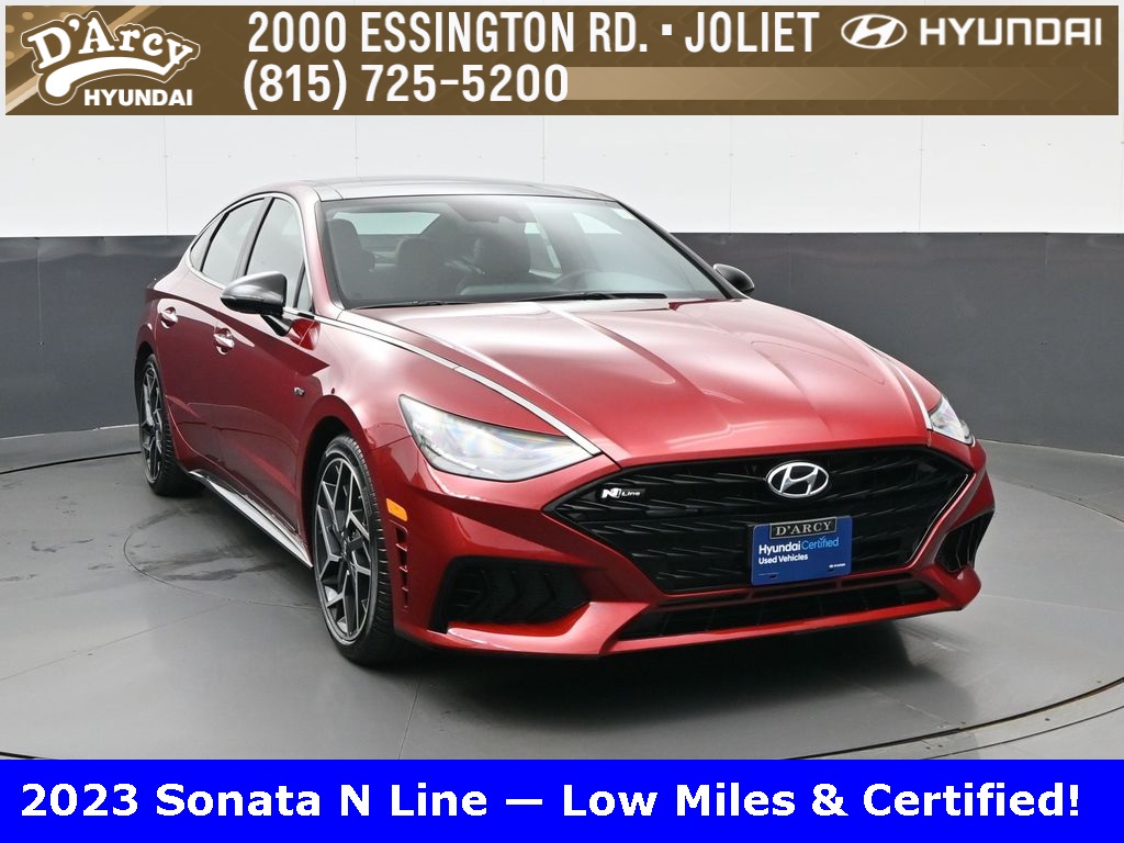 CARFAX One-Owner. One owner local trade!, Low miles!, Great vehicle history!, Remaining full factory warranty!, Navigation!, Sunroof!, Bought here serviced here!, Hyundai Certified!, Fully serviced and ready to go!. Certified. Ultimate Red 2023 Hyundai Sonata N Line FWD 8 Speed Dual Clutch 2.5L I4. Discover the D'Arcy Difference! We care - we are here and we are ready to help! Stop by www.darcyhyundai.com today to see up to date information, including showroom and service hours, and how to make an appointment or schedule delivery. D’Arcy Motors has been serving Joliet and its surrounding communities for over 25 years. Our business philosophy, which is to sell cars one car at a time and to make the guest the most important part of the process, has remained the same since 1991. Contact us today to experience the D'Arcy Difference! Pulse Safer Braking Technology for $399 added to all inventory – The rear-end collision deterrent that rapidly pulses your third brake light four times before going solid when you press the brake pedal. This feature enhances safety by helping alert trailing drivers. Odometer is 13568 miles below market average! 23/33 City/Highway MPG.