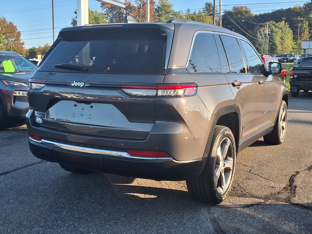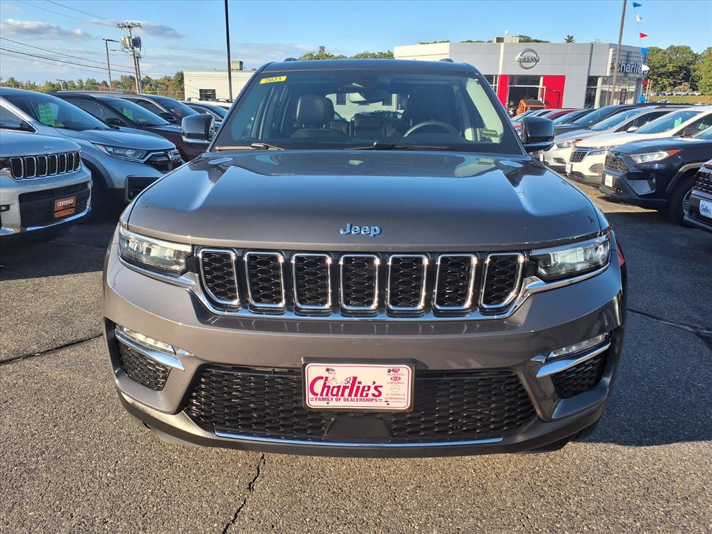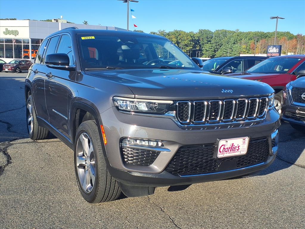 Certified Pre-Owned 2023 Jeep Grand Cherokee 4xe Base 4x4 for Sale in Augusta ME. This plug-in hybrid SUV features a Baltic Gray exterior and Global Black interior. It offers a combined fuel economy of 56 mpg and is equipped with a navigation system, lane departure warning, automatic temperature control, power moonroof, and wireless phone connectivity. The vehicle is in good condition with 26,716 miles on the odometer and comes with a battery warranty of 96 months / 100,000 miles.