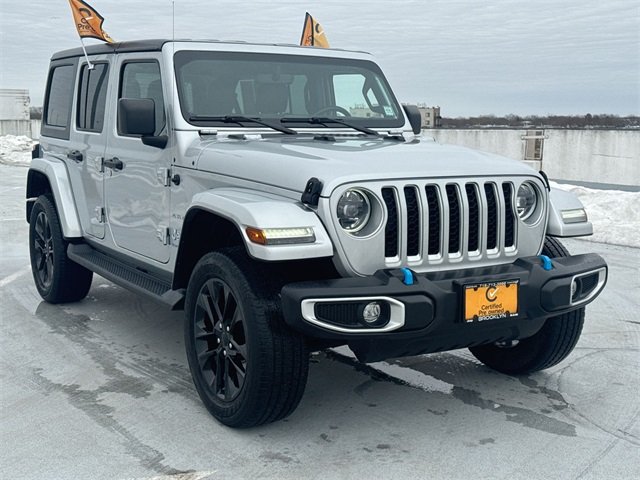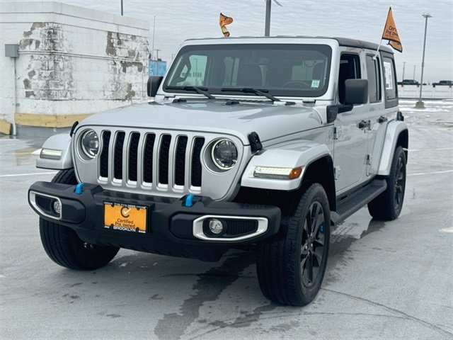 2023 Jeep Wrangler Sahara 4xe Silver Zynith Clearcoat 8-Speed Automatic CARFAX One-Owner. Wrangler Sahara 4xe, 4D Sport Utility, 2.0L I4 DOHC, 8-Speed Automatic, 4WD, Silver Zynith Clearcoat, Black Leather, 9 Speakers, AM/FM radio: SiriusXM, Apple CarPlay/Android Auto, Automatic Temperature Control, Black 3-Piece Hard Top, Brake assist, Cold Weather Group, Freedom Panel Storage Bag, Front dual zone A/C, Fully Automatic Headlights, Garage door transmitter, Heated door mirrors, Heated Front Seats, Heated Steering Wheel, Navigation System, ParkView Rear Back-Up Camera, Power door mirrors, Quick Order Package 29P Sahara, Radio data system, Radio: Uconnect 4C Nav w/8.4" Display, Rear Window Defroster, Rear Window Wiper/Washer, Remote Keyless Entry, Remote Start System, Side Steps, Speed control, Sport Suspension, Steering wheel mounted audio controls, Wheels: 20" x 8" Fully Painted Aluminum. To Protect Your Safety, Brooklyn CDJR is currently offering our Exclusive Home Services: Virtual Tour of Vehicle: We will use live interactive video chat to give you a virtual walk around of any vehicle we have in stock. Local Home Delivery: If you buy a vehicle, over the phone, email, text. We will deliver the vehicle to your home or a place of your choosing. Certified. If you need a new or Pre-Owned vehicle our Banks are here to get you on the road. 100,000 mile Certified Warranty is Available for this vehicle!