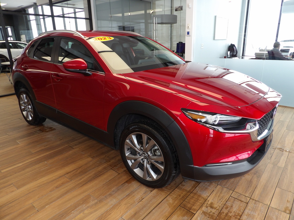 Drive in style and confidence with this stunning Red 2023 Mazda CX-30 AWD 2.5 S Select SUV. Enjoy the perfect blend of performance and efficiency thanks to its SKYACTIV-G 2.5L engine and 6-speed shiftable automatic transmission with Sport mode. This AWD SUV delivers peace of mind in any weather, while advanced safety features like Front Automatic Emergency Braking, Pedestrian Detection, Lane Keeping Assist, Blind Spot Monitoring, and Rear Cross Traffic Alert keep you protected on every journey. Inside, experience comfort with leatherette upholstery, dual-zone automatic climate control, and a customizable 7-inch instrument cluster. Stay connected with Apple CarPlay, Android Auto, and the Mazda Connect infotainment system with an 8.8-inch display. Additional highlights include a power liftgate, rain-sensing wipers, adaptive cruise control, rearview camera, and LED lighting. With its athletic design and metallic exhaust tips, this CX-30 stands out on the road. Schedule your test drive today and experience what makes the Mazda CX-30 a top choice among compact SUVs!