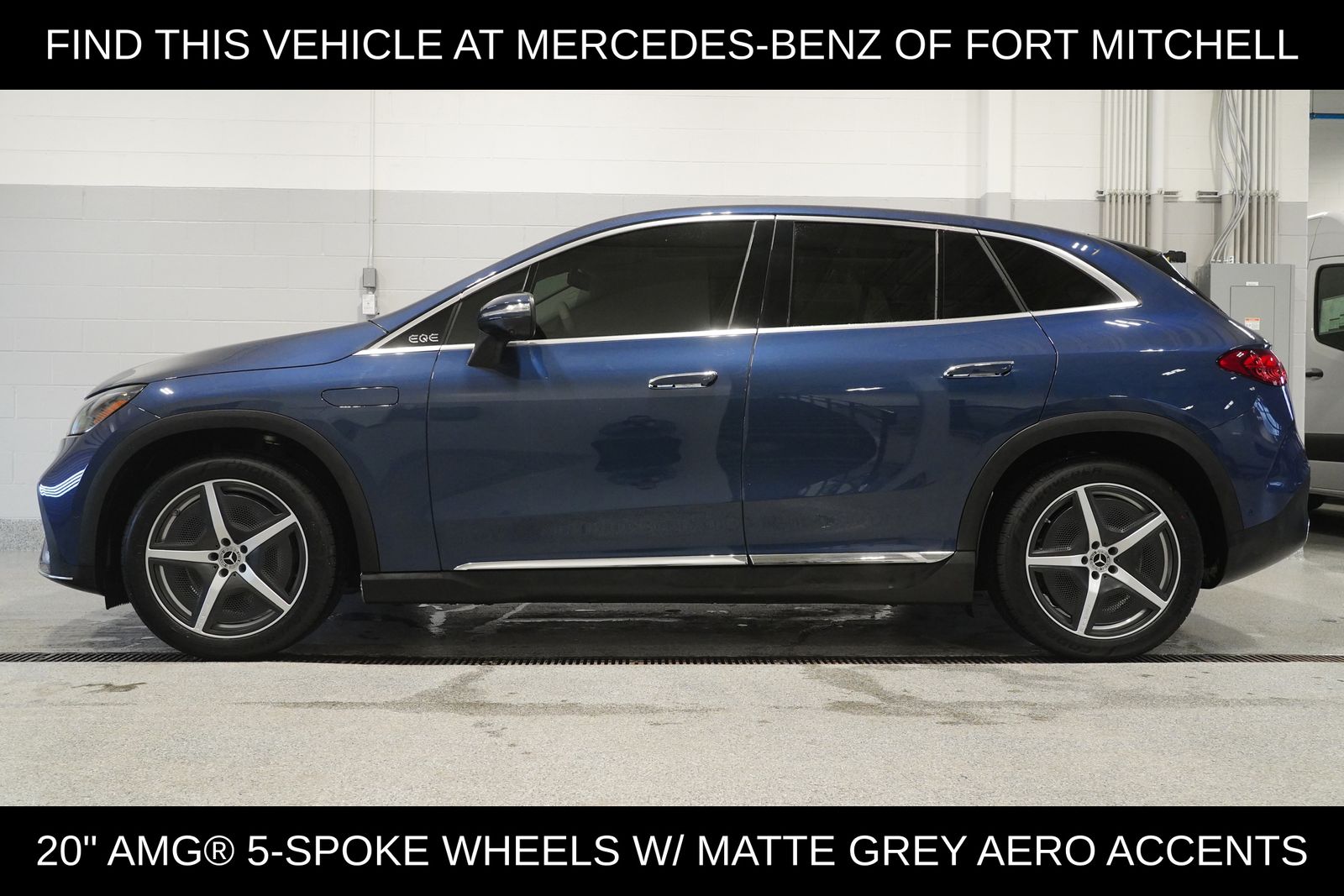 This Certified Pre-Owned 2023 Mercedes-Benz EQE 500 SUV is electric and features a Twilight Blue Metallic exterior with a Neva Gray/Biscaya Blue interior. It offers a 269-mile electric range and is equipped with a 402 horsepower engine and all-wheel drive. The vehicle is located at Mercedes-Benz of Fort Mitchell and includes a battery warranty of 120 months / 155,000 miles.