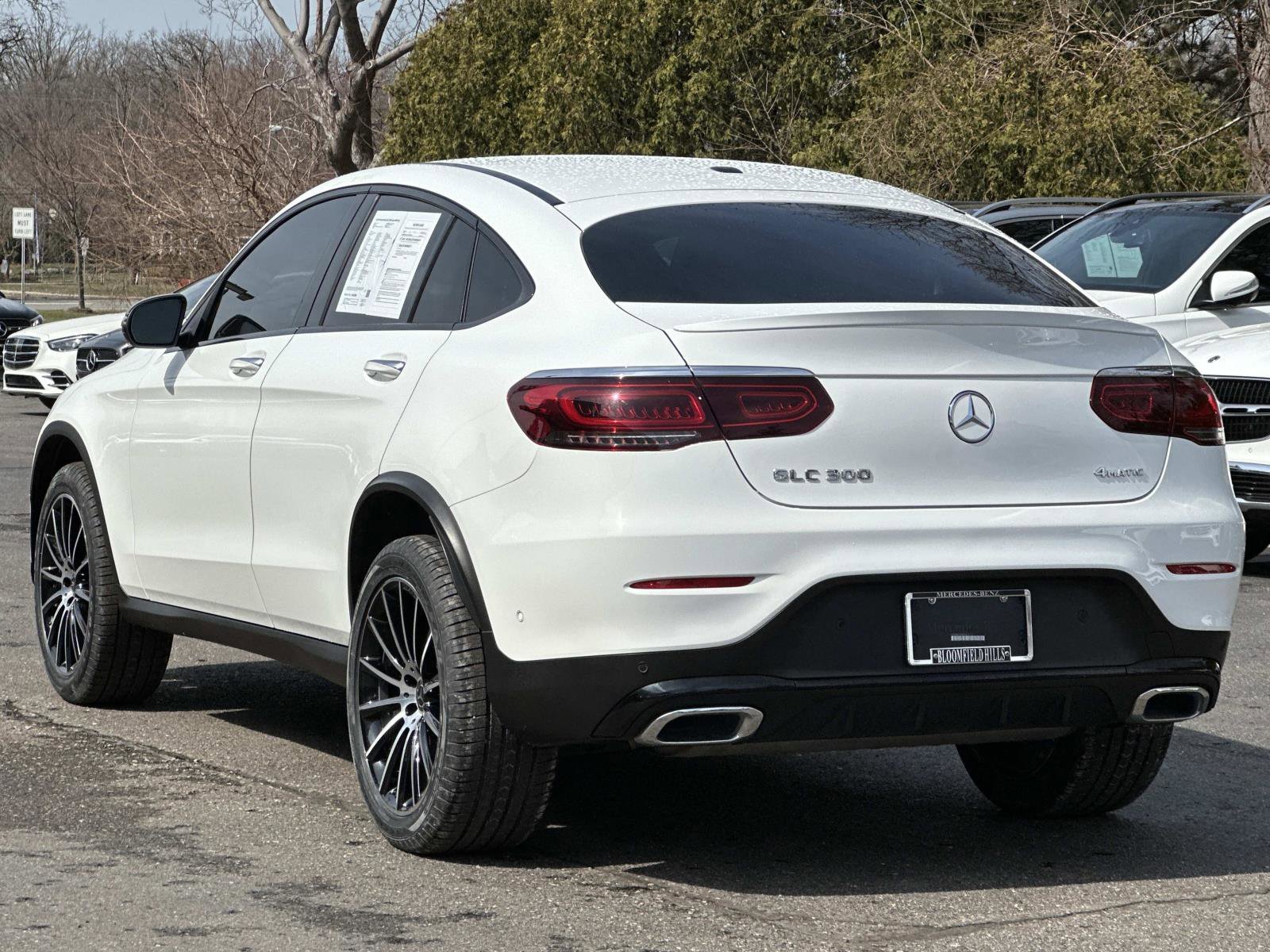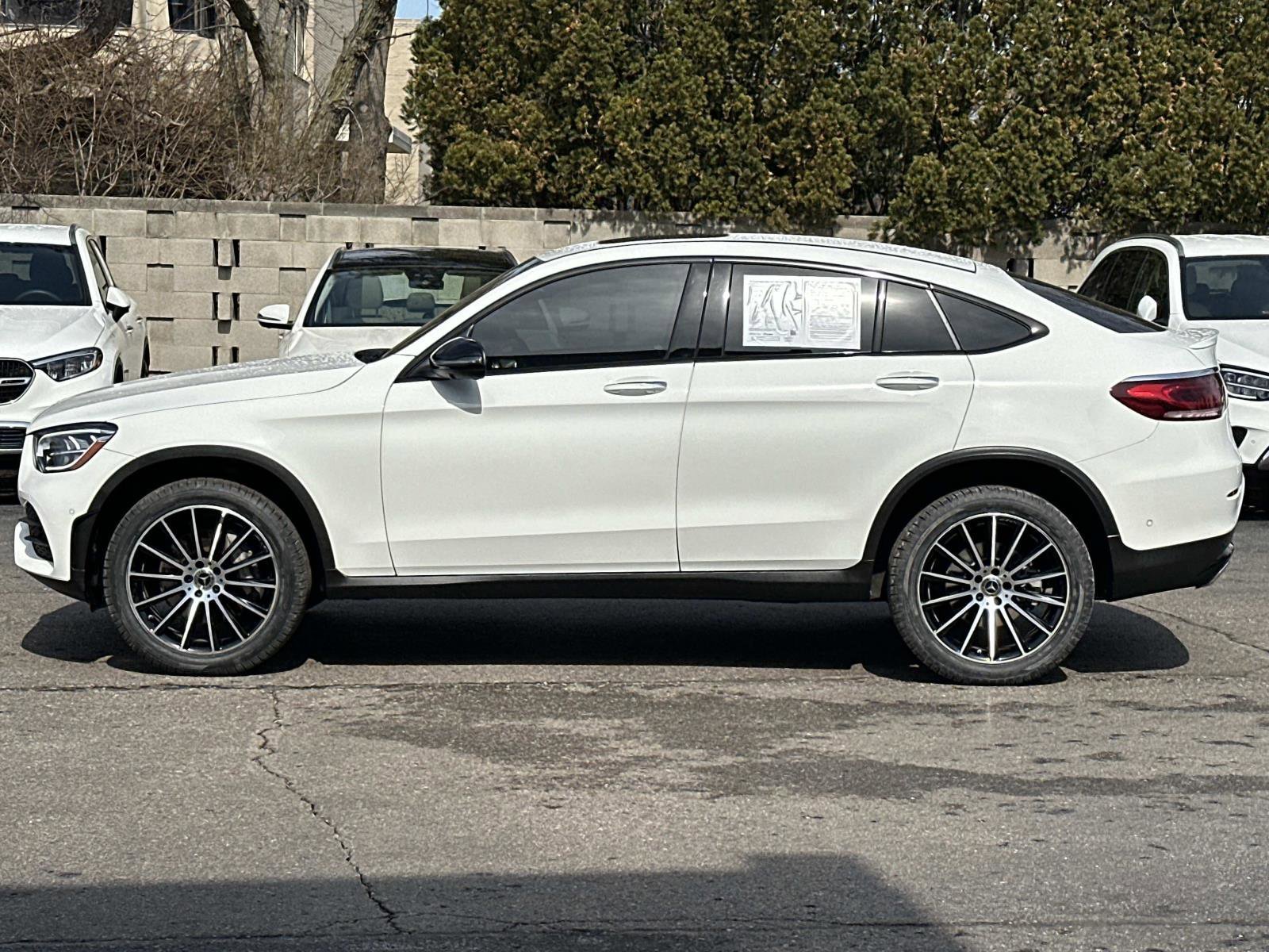 Mercedes-Benz Certified Pre-Owned Details: Warranty Deductible: $0, Transferable Warranty, Includes Trip Interruption Reimbursement and 7 days/500 miles Exchange Privilege, Limited Warranty: 12 Month/Unlimited Mile beginning after new car warranty expires or from certified purchase date, 165+ Point Inspection, Roadside Assistance, Vehicle History. Certified. Polar White 2023 Mercedes-Benz GLC GLC 300 Coupe 4MATIC® 4MATIC® 9-Speed Automatic I4 Mercedes Certified Unlimited Mileage Warranty, 4-Way Lumbar Support, 4-Wheel Disc Brakes, 6 Speakers, ABS brakes, Air Conditioning, Alloy wheels, AMG Line, Apple CarPlay/Android Auto, Augmented Video for Navigation, Auto High-beam Headlights, Auto tilt-away steering wheel, Auto-dimming door mirrors, Auto-dimming Rear-View mirror, Automatic temperature control, Brake assist, Child-Seat-Sensing Airbag, Electronic Stability Control, Emergency communication system: eCall, Exterior Parking Camera Rear, Four wheel independent suspension, Front dual zone A/C, Fully automatic headlights, Garage door transmitter: HomeLink, Heated door mirrors, Heated Front Bucket Seats, Heated front seats, High-Gloss Black Elements, Illuminated entry, Knee airbag, Leather steering wheel, Live Traffic, Low tire pressure warning, MB-Tex Upholstery, Memory seat, Mercedes-Benz Navigation, Multimedia Package, Navigation Services, Night Package, Occupant sensing airbag, Outside temperature display, Overhead airbag, Overhead console, Panic alarm.
